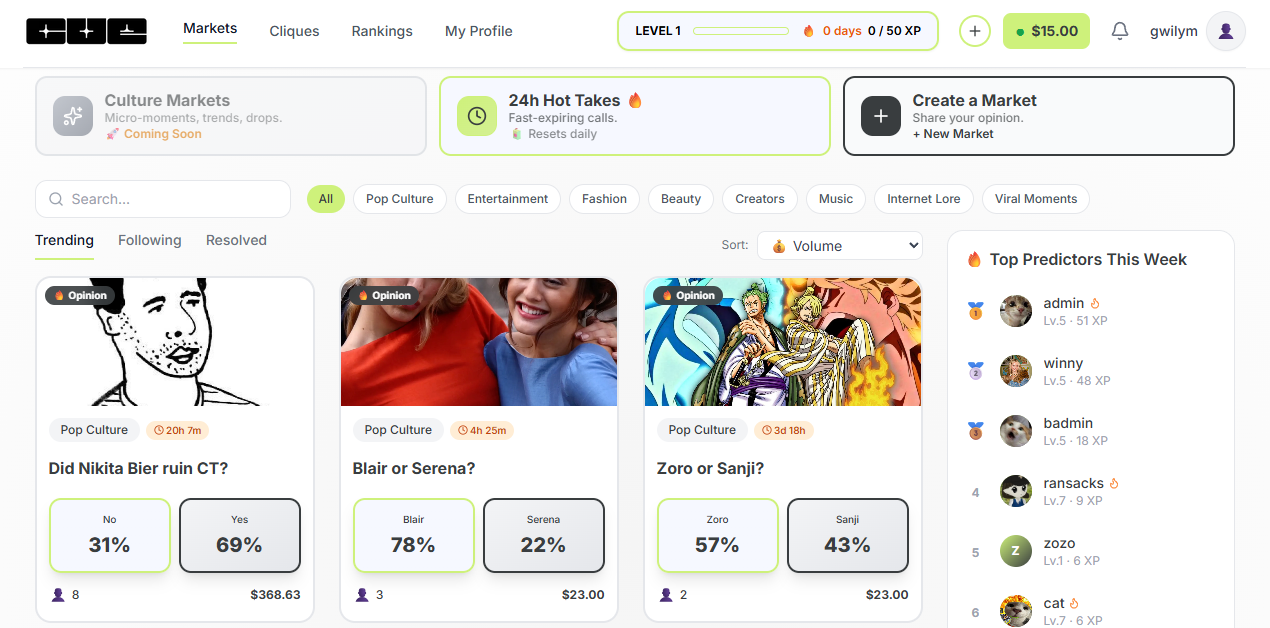 - Next, on the main "Markets" page you can surf open markets across broad categories like "Trending" or "Following," or zoom into more specific subcategories like Pop Culture, Entertainment, etc. Once you find a market that intrigues you, click on it to bring up its dedicated dashboard. You'll then see a page like so: