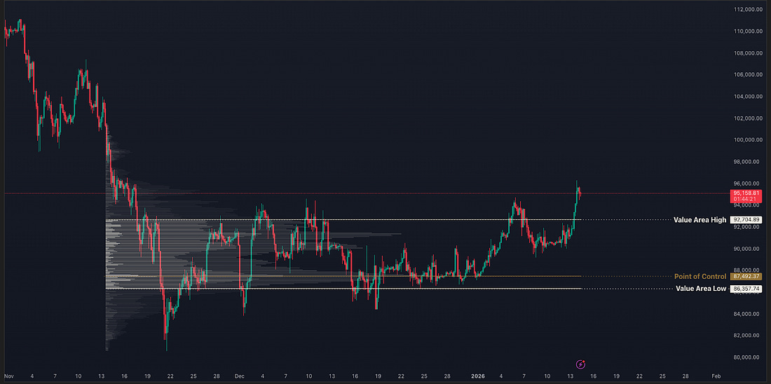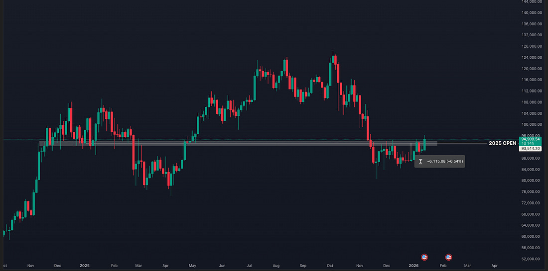 This is the same 3-day chart, but with another emphasis. We drew this chart to show that a gain in price not only puts price above dynamic averages, but would also reclaim this important level. We described last week that it showed demand (support) in late 2024 and early 2025, but has shown supply (resistance) in late 2025 and early 2026. Dr. Andre Dragosch (Head of Research Europe at Bitwise) pointed out that they’ve flagged this level as important to reclaim, because it’s also the 2025 open, and regaining this level means price is catching up on last year’s losses.