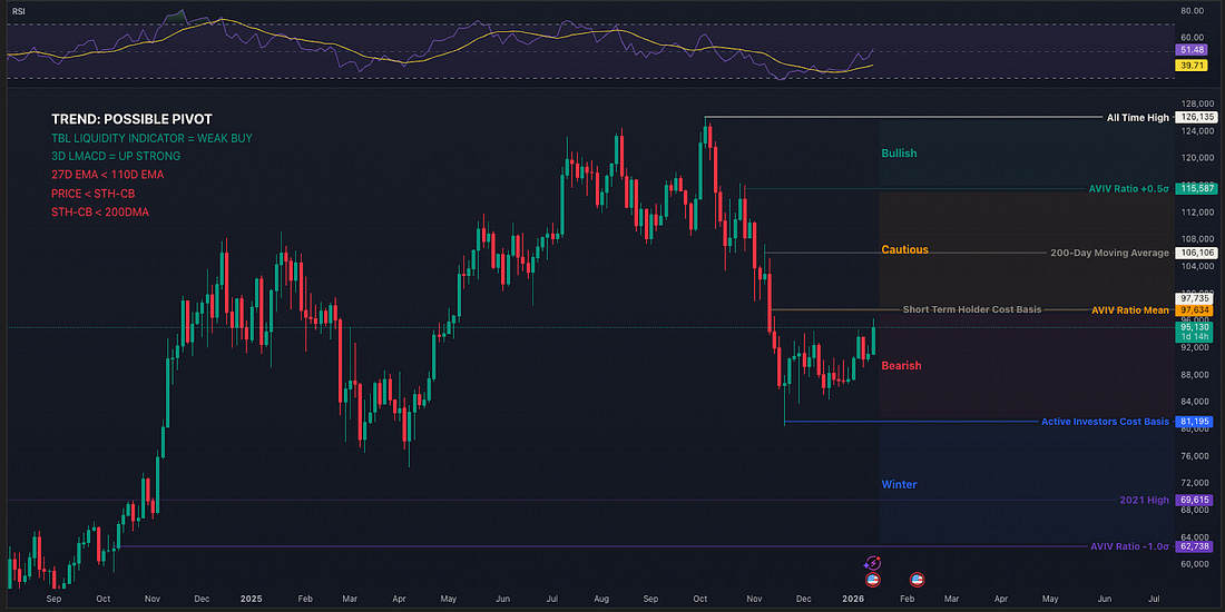 As bitcoin’s role in the global financial landscape evolves, understanding its potential impact on your wealth becomes increasingly crucial. Whether we see measured adoption or accelerated hyperbitcoinization, being prepared for various scenarios can make the difference between merely participating and truly optimizing your position. This is why Unchained developed the Bitcoin Calculator – a sophisticated modeling tool that helps you visualize and prepare for multiple bitcoin futures. Beyond traditional retirement planning, it offers deep insight into how different adoption scenarios could transform your wealth trajectory. What sets this tool apart is its integration with the Unchained IRA – the only solution that combines the tax advantages of a retirement account with the security of self-custody. In any future state, maintaining direct control of your keys remains fundamental to your bitcoin strategy. Explore your potential future What this means for bitcoin and risk assets:🚨 We have added a “what this means for bitcoin and risk assets” summary at the end of all sections, giving you the key takeaway from each section.🚨 Last week, while writing ‘Trend Assessment’, bitcoin was trying to break out of the range in which it has been trading for two months. We showed the same chart as below and pointed out that, to confirm a breakout of the range, we wanted to see an entire candle body above $93,500 and not “just a close”. Our conservative stance was proven right, because the rally got faded again for the third time in this range, and we almost got an engulfing bearish candle. We also said recently that we saw some bullish positioning for January in the options market. Strategy bought 13,000 BTC again last week. And with STRC trading around $100 because of the ex-date on January 15, they probably hit the ATM to cap the price at $100 and will be buying more bitcoin with the proceeds. The overview chart didn’t change much, but one thing to notice is that the Short-Term Holder Cost Basis is now practically equal to the AVIV ratio mean, which is very interesting. Price getting above the STH-CB means the trend reversed from a downtrend to an uptrend. Price getting above the AVIV ratio mean tells us that the regime changed back from (mini) bear to bull. We’ll explain this further in the on-chain analysis section.