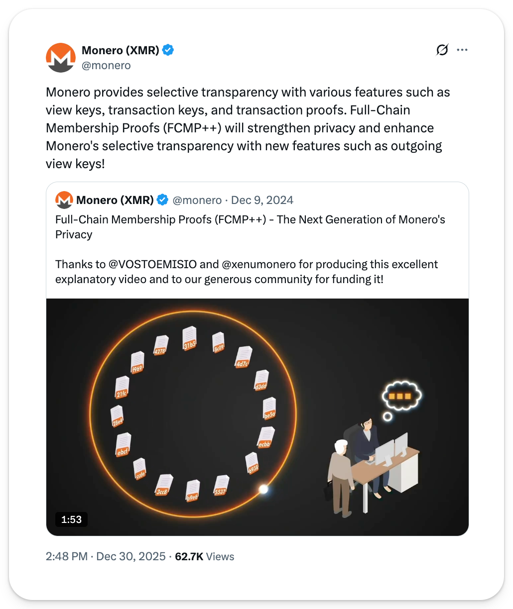 Zcash, on the other hand, uses zk-SNARKs to provide privacy, allowing transactions to be proven valid without revealing sender, receiver, or amount. To accomplish this, when you send a shielded transaction, Zcash generates a cryptographic proof that the network verifies — confirming you have the right to spend the coins and that inputs equal outputs — without having to inspect the actual transaction details. Mandatory vs. Optional PrivacyWith Monero, privacy is mandatory. You cannot send a transparent transaction. This creates "herd immunity" — all transactions look identical, so no one stands out. The argument: optional privacy isn't real privacy. If only "suspicious" people use the private option, they become targets — a strong point. Zcash offers privacy by choice. ZEC can be used transparently, or moved to a shielded address, where ZK functionality is then used to obfuscate transaction details and state. Users can move between these freely. While privacy may not be required, the shielded pool continues to grow – around 30% of ZEC supply now sits in shielded pools, up from 8.7% a year ago. Consensus and Supply DifferencesMonero uses the RandomX proof-of-work algorithm, designed to be ASIC-resistant and optimized for general-purpose CPUs friendly to at-home solo miners. Monero also has a tail emission — an infinite supply with a fixed small amount added forever (around 0.6 XMR per block perpetually). This ensures miners always have incentive to secure the network. Zcash currently uses Equihash – an ASIC-optimized proof-of-work consensus mechanism that tends to favor specialized miners. It is transitioning to Crosslink, a hybrid proof-of-work/proof-of-stake system that brings deterministic transaction finality to the network. In pure PoW systems, blocks are never truly "final" — they just quickly become statistically harder to reverse. This isn't an issue you hear about for Bitcoin, but can theoretically leave much smaller networks vulnerable to 51% attacks and create major issues for securely bridging to other chains. Crosslink layers a PoS "finality gadget" on top of PoW: miners continue producing blocks, but stakers provide a second confirmation that makes transactions permanent and irreversible. Like Bitcoin — which it originally forked — Zcash has a fixed supply cap of 21 million ZEC with a halving schedule roughly every four years. What's Next for EachBoth protocols have major upgrades in development that could shift the competitive landscape. - Monero is working on FCMP++ (Full-Chain Membership Proofs), a major upgrade that would replace current ring signatures. Instead of mixing with around 16 decoys, transactions would mix with the entire blockchain history. This dramatically expands the anonymity set from "crowd of 16" to "crowd of everyone" — potentially neutralizing Zcash's shielded pool advantage.
