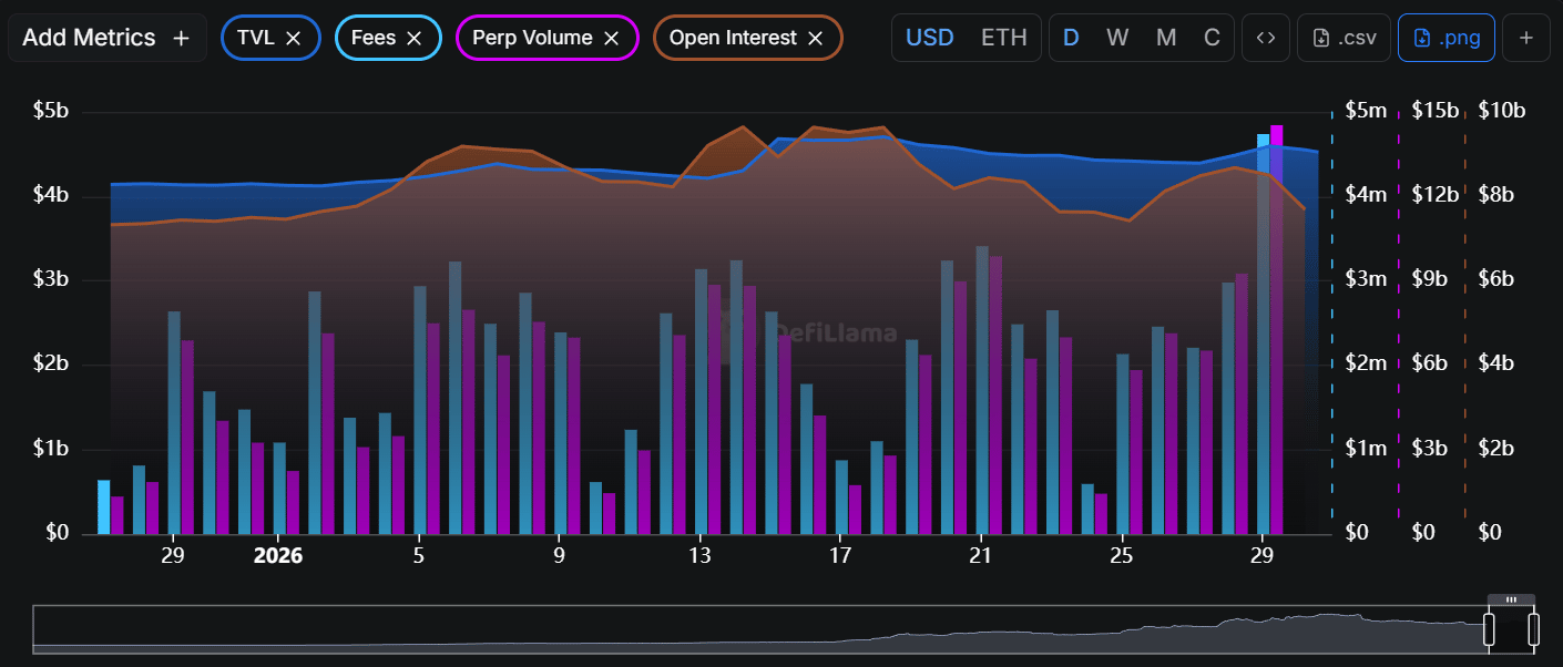 Even though it's not as clear as the market share vs CEXes, other metrics like fees and perp volume are trending upwards in 2026.