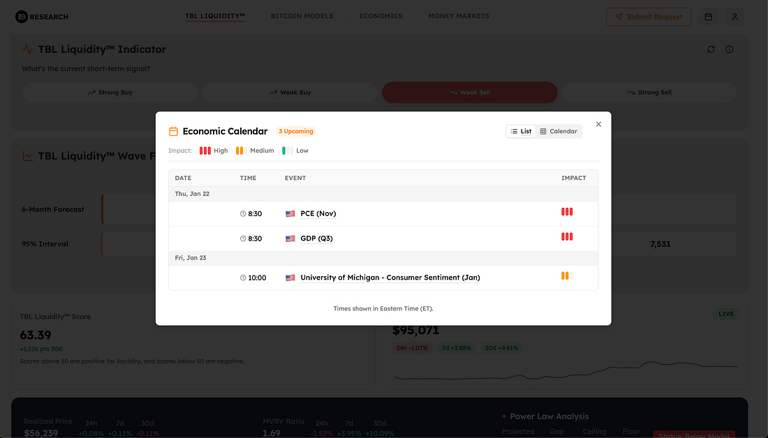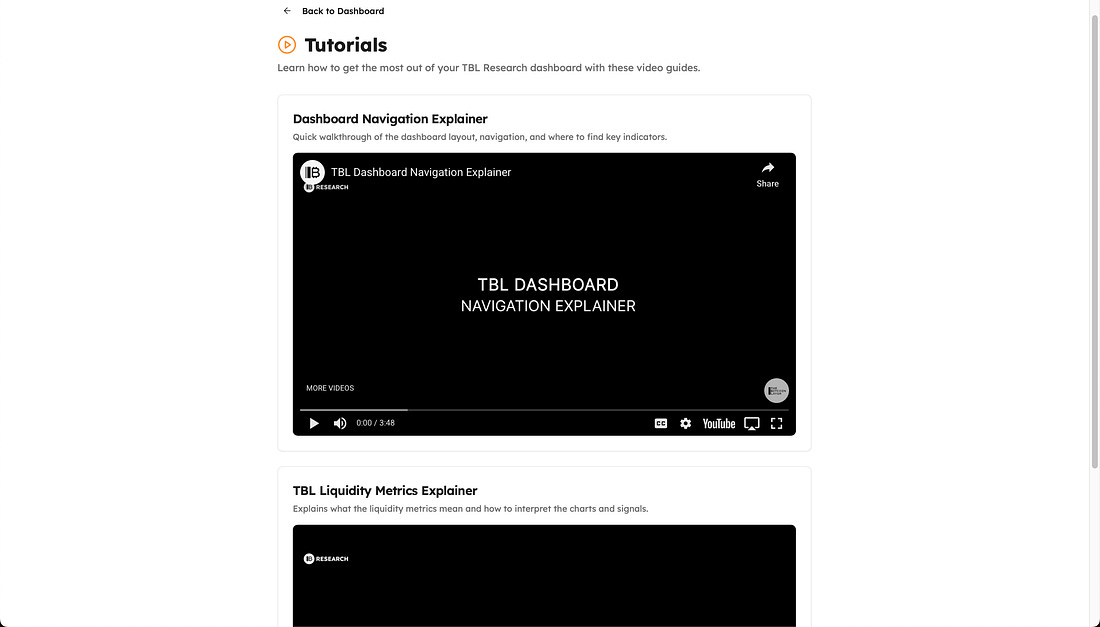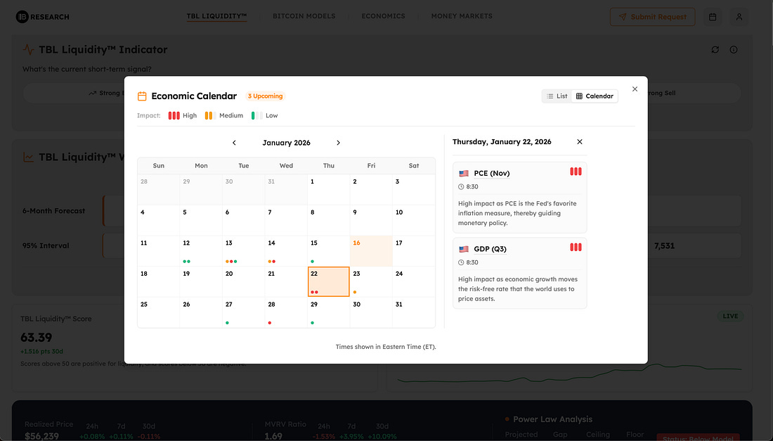 Hello TBL subscribers, We’ve added two new features to the TBL Research Dashboard that move it closer to what we want it to be: a single place for tracking the most important macroeconomic signals and understanding how they connect to bitcoin. Live Economic CalendarThe dashboard now includes a LIVE economic calendar covering the most important macro releases that move markets. You can view upcoming events in a clean list view or a full calendar view, with each release tagged by impact level and paired with a short explanation of why it matters. This makes it easier to stay ahead of inflation prints, growth data, labor reports, and Fed-related events, without jumping between sites or feeds. We’ve filtered the calendar to include only the data releases that matter most for global macro, and by extension bitcoin, and it lives directly inside the dashboard in the top-right, next to your profile and Submit Request. Built-In TutorialsWe’ve also added a Tutorials section inside the dashboard. These short videos walk through: