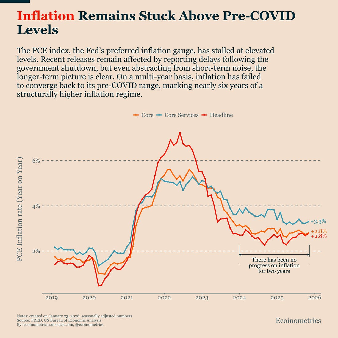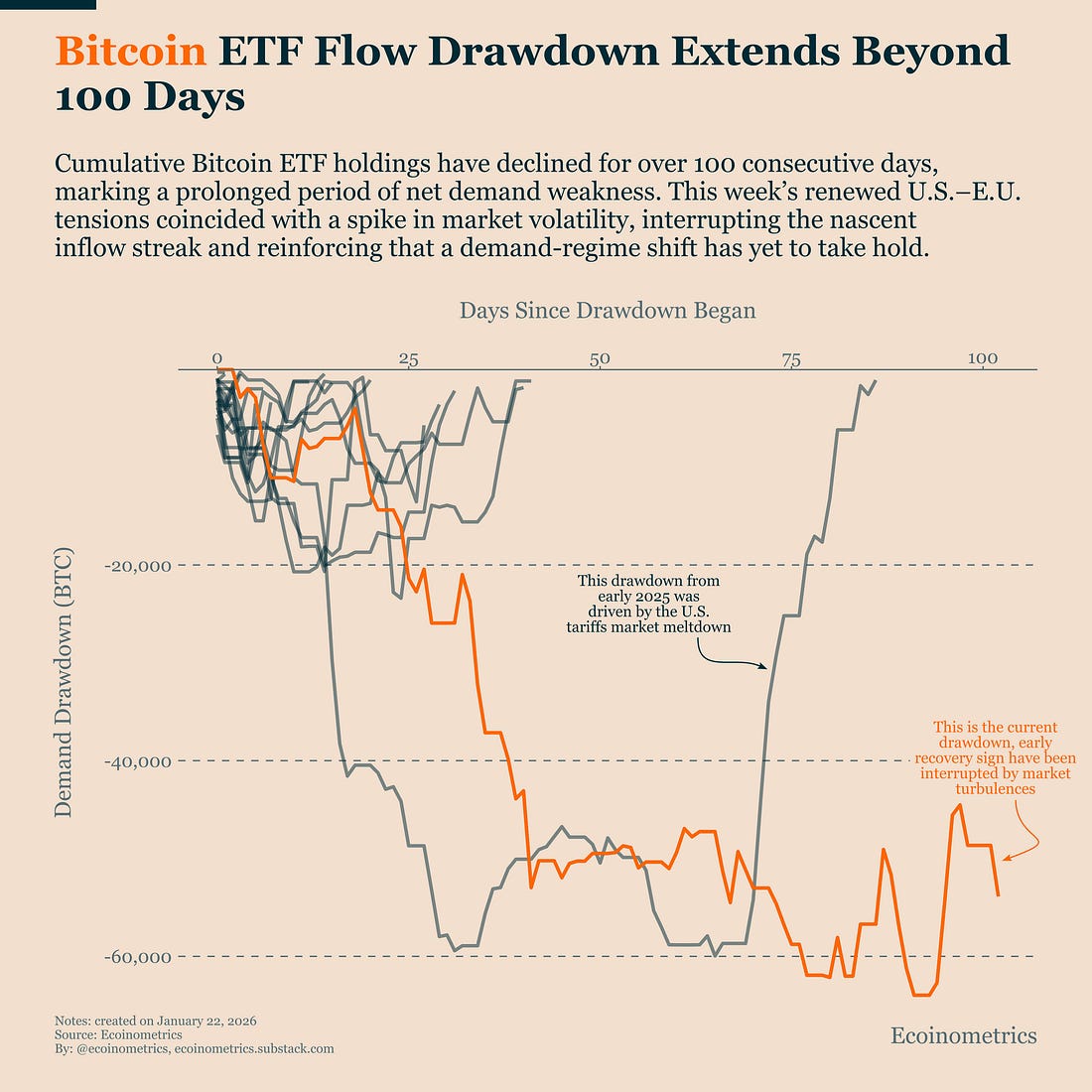 Taken together, these three charts point to the same conclusion from different angles. Bitcoin’s price action isn’t being held back by a single shock or headline risk. It’s being constrained by a broader setup where fresh demand remains fragile, capital continues to favour defensive assets during uncertainty, and monetary policy lacks the room to turn meaningfully supportive. That combination doesn’t rule out recovery. But it does mean that upside remains conditional, easily interrupted, and highly sensitive to confirmation rather than narrative. In this environment, what matters most is not isolated signals, but whether they can reinforce each other over time. In case you missed it, here are the other topics we covered this week: Get these professional-grade insights delivered to your inbox: Still No Demand Regime Change for BitcoinLast week, Bitcoin briefly crossed an important threshold: rolling 30-day ETF flows turned positive. That matters because sustained ETF inflows are a precondition for any durable price recovery. Without new capital consistently entering through ETFs, upside moves tend to stall rather than compound. We also flagged at the time that this was only an early signal, not confirmation. This week made that distinction clear. Renewed geopolitical tensions spilled into broader markets, triggering another bout of risk-off behaviour… again. Since the start of the Trump administration last year, this pattern has repeated itself again and again: periods of calm interrupted by tariff threats, policy headlines, and sudden volatility. Most risk assets managed to recover from the latest shock. Bitcoin didn’t. The reason is simple. Bitcoin isn’t just dealing with macro uncertainty, it’s also coming off a deep and prolonged drawdown in capital flows. As the chart shows, cumulative Bitcoin ETF flows have now been in drawdown for more than 100 consecutive days. That’s an unusually long stretch of sustained net demand weakness. When demand is this fragile, even modest spikes in volatility are enough to interrupt recovery attempts, which is exactly what happened this week, as the nascent inflow streak broke once again and rolling flows are negative once more. The result is a market that remains unresolved. A recovery is still possible, but it is not yet self-reinforcing. Until ETF inflows can persist through periods of broader market stress, Bitcoin remains in an undecided demand regime rather than a confirmed recovery phase. Gold ETF Flows Are Catching Up to BitcoinEarlier this week, we looked at how correlation dynamics across macro assets influence Bitcoin’s behaviour. One of the key conclusions was that, in the current environment, gold has been quietly benefiting at Bitcoin’s expense. When you zoom out, that shift becomes very clear. The chart below compares cumulative net flows into Bitcoin ETFs and gold ETFs since the launch of spot Bitcoin ETFs in early 2024. Bitcoin initially dominated, attracting significantly more capital than gold. But that gap has narrowed sharply over the past few months. Since November, Bitcoin ETF flows have stalled. Gold ETF flows haven’t. As a result, gold is now only about $6 billion behind Bitcoin’s roughly $58 billion in cumulative net inflows over the same period. And the gap continues to close. This isn’t happening because gold and Bitcoin are telling different long-term stories. In fact, they share many of the same structural narratives around hard assets and protection against monetary debasement. The difference shows up in the short term. Repeated risk-off episodes (many tied to U.S. tariff threats and policy uncertainty since 2025) have consistently favoured gold. During those moments, gold tends to attract fresh inflows, while Bitcoin behaves more like a risk asset and struggles to retain momentum. In other words, even when both assets rise over long horizons, their demand dynamics diverge when uncertainty spikes. And over the past year, those spikes have been frequent enough to steadily tilt relative flows toward gold. Inflation Data Is Not Conducive to Rate CutsMarkets broadly expect the upcoming FOMC meeting to result in no change to the policy rate. Part of that expectation is political. Fed Chair Jerome Powell has been explicit that monetary policy will remain data-driven, and cutting rates while facing overt political pressure would require a clear justification in the numbers. That justification isn’t there. The labor market hasn’t broken, despite repeated fears over the second half of 2025. And inflation continues to pose essentially the same challenge it did two years ago. The chart below shows year-on-year PCE inflation, which I remind you is the Fed’s preferred gauge of inflation. Even smoothing out short-term noise and data delays related to the government shutdown, the message is straightforward: inflation has been stuck at elevated levels for roughly two years. More importantly, it remains well above its pre-COVID range. That matters because the COVID shock is no longer recent history. We are now nearly six years removed from the 2020 crisis. Year after year of inflation running above target compounds, both economically and politically, and it limits how much flexibility the Federal Reserve has. Absent a clear downside surprise in inflation or a sudden deterioration in growth, this makes a fast or aggressive rate-cutting cycle unlikely. Cuts may still come eventually, but they are likely to be cautious and conditional rather than front-loaded. This isn’t a new message from the Fed, and it probably won’t rattle markets on its own. But it does act as a brake on how quickly risk-on assets can expand, even if it lacks the shock value of tariff headlines or geopolitical flare-ups. Tactical TakeawayThe current setup argues for restraint rather than anticipation. Bitcoin is not facing an outright hostile environment, but it is still operating without durable demand confirmation and without mean