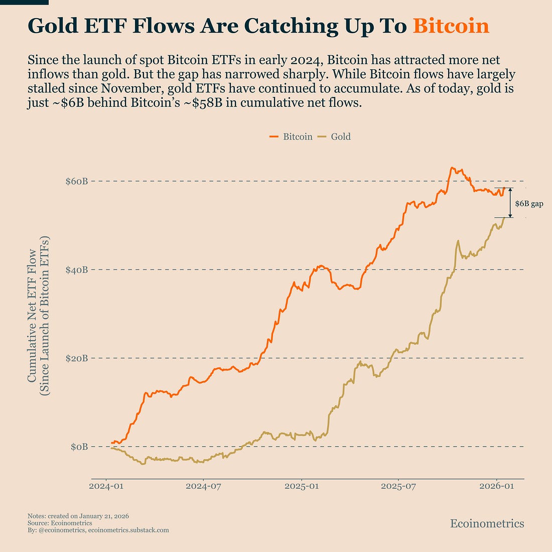 Still No Demand Regime Change for BitcoinAlso Gold ETF Flows Are Catching Up to Bitcoin & Inflation Data Is Not Conducive to Rate CutsWelcome to Ecoinometrics’ Friday edition. Each week, we analyze the three most critical market signals impacting Bitcoin and macro assets, delivering institutional-grade insights through data-driven charts and analysis. Today we’ll cover:
