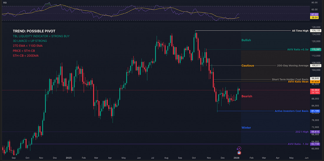 Bitcoin has been in a downtrend since October 10, 2025. This downtrend moved the price of bitcoin from the Bullish zone into the Bearish zone. The big question is whether this downtrend continues, or if price is forming a bottom and the trend pivots back up. As bitcoin’s role in the global financial landscape evolves, understanding its potential impact on your wealth becomes increasingly crucial. Whether we see measured adoption or accelerated hyperbitcoinization, being prepared for various scenarios can make the difference between merely participating and truly optimizing your position. This is why Unchained developed the Bitcoin Calculator – a sophisticated modeling tool that helps you visualize and prepare for multiple bitcoin futures. Beyond traditional retirement planning, it offers deep insight into how different adoption scenarios could transform your wealth trajectory. What sets this tool apart is its integration with the Unchained IRA – the only solution that combines the tax advantages of a retirement account with the security of self-custody. In any future state, maintaining direct control of your keys remains fundamental to your bitcoin strategy. To assess whether the trend is pivoting, we build on the framework we explored in the letter “No Holy Levels.” What matters is staying consistent with the timeframe you use to assess the trend. We’ve been using the 3-day chart for a while now. Before we dissect the trend assessment, we can see on this chart that some indicators have flipped green, pointing to a possible pivot, while others are lagging and still need to turn. The TBL Liquidity Indicator is often discussed and explained by Augustine and Nik, so I won’t go into the mechanics here. It’s an important foundation of the trend assessment, and it’s hard to ignore that it has been flashing a “Strong Buy” for a while now. We’ll discuss the other indicators further down in this letter. Price action matters most. The candle chart is a good visualization of how price behaved around certain levels. Technical indicators, while we use them because they can be useful, are ultimately derivatives of price action. Every indicator has its own trade-off, and none are perfect... Subscribe to The Bitcoin Layer to unlock the rest.Become a paying subscriber of The Bitcoin Layer to get access to this post and other subscriber-only content. A subscription gets you: