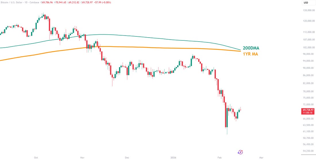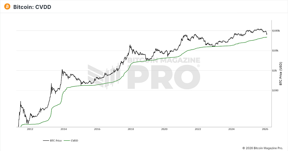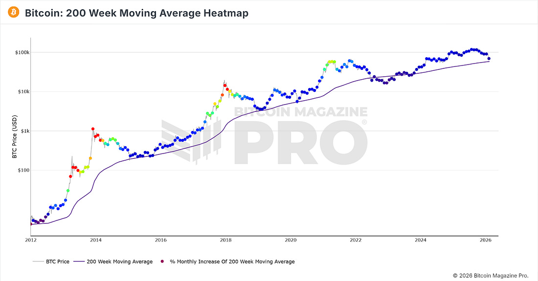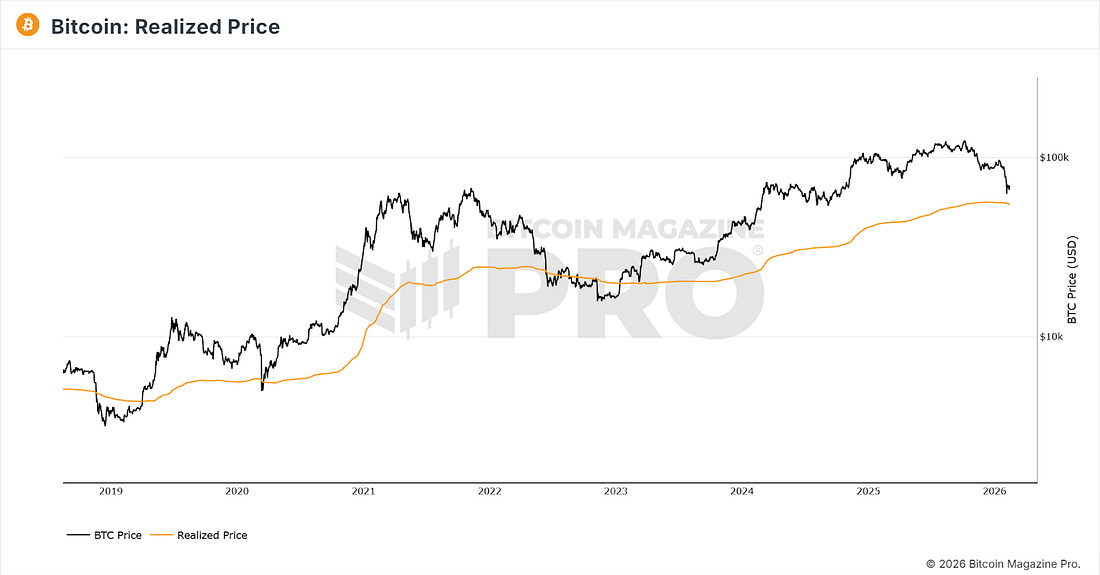 3 Potential Levels for a Bear Market LowFrom Realized Price to the 200-Week Moving Average, we examine three historical support zones that could define Bitcoin’s next macro bottom.What’s HappeningPrice ActionBitcoin is in a period of consolidation after its push down to $60,000 on the 8th February, which is the sharp down move at the bottom of the chart below. The chart shows the past month’s price action: a broad downtrend, followed by a capitulation on 8th Feb, and since then, consolidation. Figure 1: BTC past month price action. Over the past few days, it has been trading around $70,000 as the market tries to determine whether the next major trend will be up or down. Such periods can be particularly dangerous for trend traders, who may get caught up in choppy price action that ultimately goes sideways, frustrating both long-biased and short-biased trend traders. The bears remain convinced that Bitcoin will plunge down below the two major supports of the 200-week moving average and Realized Price - see our main story below - which is certainly a possibility, but for now BTC is trying to break back upwards into the +$70,000 range. Figure 2: Bitcoin trying to consolidate after the drop to $60,000. If Bitcoin can break above the low $70,000’s, then there is very little resistance between there and the bottom of the range, where price broke down at the start of the year in the low $80,000’s. Such a move would definitely catch the bears off guard, but there is no sign just yet that BTC is ready to do it. Patience may be required for a while, especially as BTC continues to chop within the current narrow range around $70,000. The Big Story: How Low Could Bitcoin Go?Bitcoin has strongly rebounded from $60,000, and that may well be as low as it goes before climbing back up, ultimately to new all-time highs. However, many believe that with geopolitical uncertainty and traditional markets looking questionable, there may be further pain in store for Bitcoin in 2026. Should such a bearish scenario play out, how much further is Bitcoin likely to go down from here? Below, we look at three charts that show potential levels at which Bitcoin could bottom to form a bear market low before moving up into a new bull run. Note, Bitcoin certainly does not HAVE to go down to any of these levels, but it is always a worthwhile exercise to look at scenarios and consider what you would do should price go down to them, to ensure irrational decisions are not made at market extremes. Bitcoin realized price is the average price at which all existing bitcoins last moved onchain, calculated by dividing Bitcoin’s realized cap (the value of each coin at the price it last transacted) by the current circulating supply. It’s often used as an onchain “aggregate cost basis” for the market, meaning when Bitcoin trades above realized price the average holder is in profit, and when it trades below it the average holder is at a loss. It is one of the core onchain metrics that many others have since be built off. Figure 3: Realized Price It is currently at $54,887. It is worth noting that major bear market lows throughout Bitcoin history have arrived when BTC has started to trade below the Realized Price. Bitcoin 200-Week Moving Average The 200-week moving average is one of the most basic support levels for Bitcoin, being just a simple moving average. On Bitcoin’s move down to $60,000 on Feb 8, it came very close to tapping the moving average, which is currently at $58,200. Figure 4: 200 Week Moving Average The chart above shows that throughout Bitcoin’s history, the 200WMA has generally held as support, except during the FTX crash in 2022, when BTC spent several weeks below it before breaking back above and entering a new bull run. Cumulative Value Days Destroyed (CVDD) A metric devised by Willy Woo, this indicator has successfully identified every major bear-market low in prior bear markets. Figure 5: CVDD This metric is a derivative of the well-established Coin Days Destroyed, dividing the destruction accumulated over time by the market’s age. The result is the green line on the chart above, which BTC has reached in all previous bear markets. It is currently trading at $47,156. These are the three major supports remaining below the current price for BTC. However, we are in a new era for Bitcoin, with institutions now acting as the major players in the market. So is this time different when it comes to the bear market low? Only time will tell. To view all of these charts and receive more in-depth analysis, subscribe to the Bitcoin Magazine Pro platform here. The Bitcoin Magazine Pro Team. Bitcoin Magazine ProFor more detailed Bitcoin analysis and to access advanced features like live charts, personalized indicator alerts, and in-depth industry reports, check out Bitcoin Magazine Pro. Make Smarter Decisions About Bitcoin. Join millions of investors who get clarity about Bitcoin using data analytics you can’t get anywhere else. We don’t just provide data for data’s sake, we provide the metrics and tools that really matter. So you get to supercharge your insights, not your workload. Take the next step in your Bitcoin investing journey:
