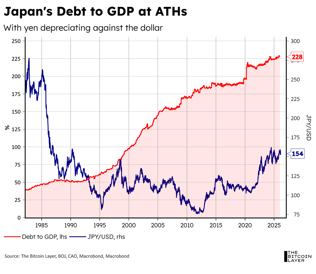 Although it’s still too early to run laps around doomers, we try our best to remain as stoic as possible when these headlines hit the tape. Our narrative on the Japanese story basically holds hands with what Lyn Alden discusses in her latest newsletter: not only can Japan phone the US (something we discussed here), but they are also the largest foreign holders of US Treasuries (chart below—something we discussed here): Many are concerned about printing yen to buy JGBs as the only way to backstop yields from rising, amidst its highest debt-to-GDP level (chart below): However, there are ways to avoid such yen depreciation if the Japanese central bank were to perform more YCC. Japan has enough USTs to defend its currency by selling American debt and buying back yen. As Alden puts it: