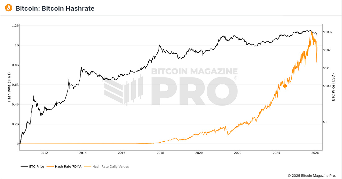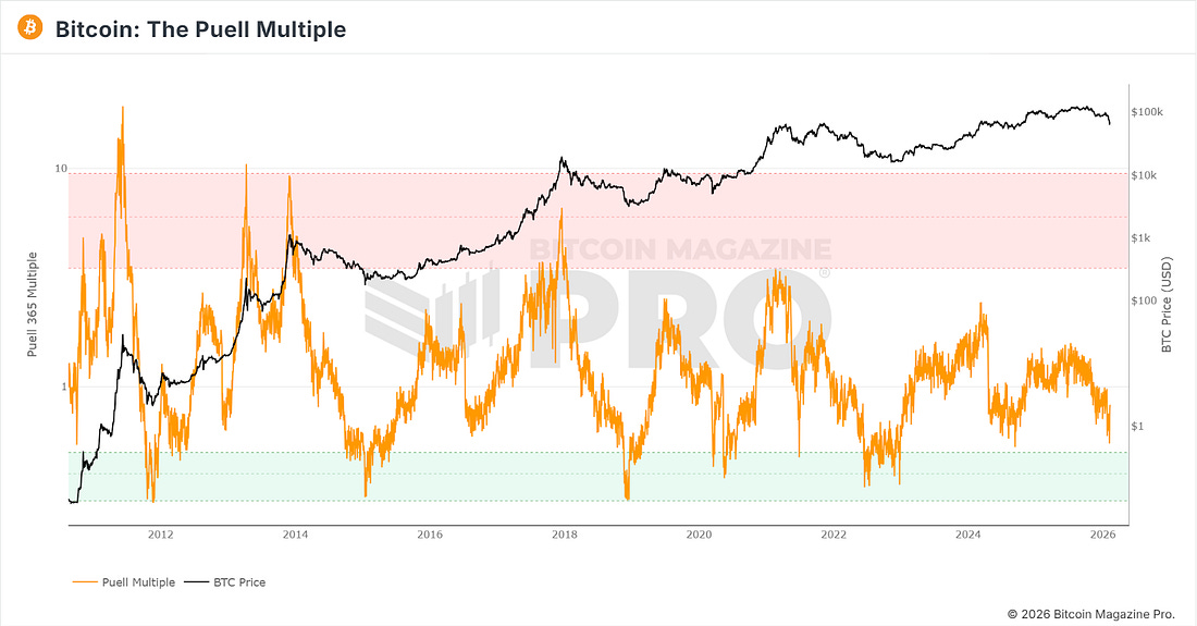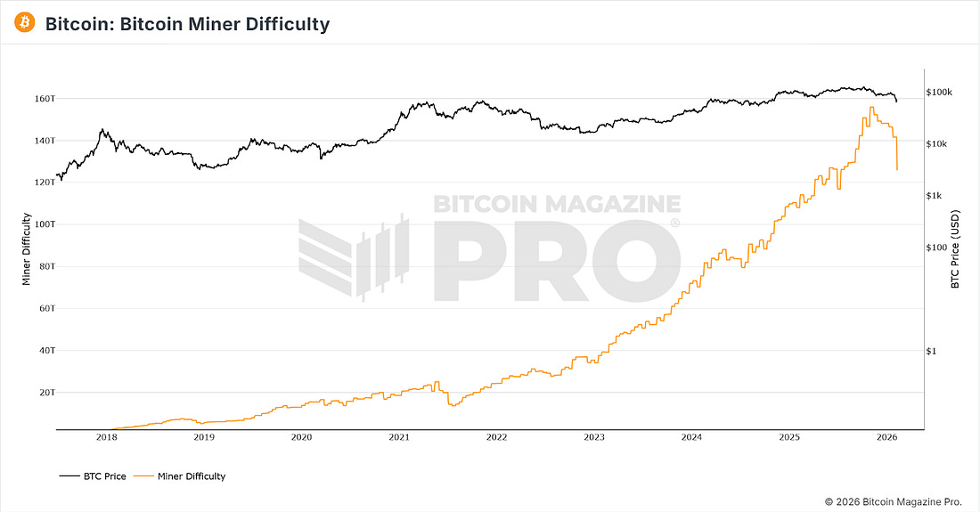 Figure 3: BTC approaching major support levels. In previous bear markets, BTC has reached and spent some time at or below these two levels. It remains to be seen whether BTC price will drop below them again - or whether this time is different. We discuss this in much more detail with our platform subscribers. You can subscribe here. The Big Story: A Sharp Reset for Bitcoin MinersBitcoin’s mining landscape has just experienced one of its most abrupt resets in years. At the latest difficulty retarget, mining difficulty fell by 11.16%, dropping to 125.86 trillion. This was the largest negative adjustment since mid-2021 and ranks among the steepest difficulty declines in Bitcoin’s history. In practical terms, blocks had been taking significantly longer than the 10-minute target, which reflected a sudden reduction in active computing power across the network. Figure 4: Major drop in mining difficulty. That slowdown is clear in the hashrate data. Over the past month, total network hashrate has fallen by roughly 20%, with a particularly sharp pullback in recent weeks. After reaching record highs late last year, hashrate has retraced quickly as miners respond to weakening economics and temporary power disruptions. Figure 5: Hashrate drop. Price has been a major pressure point. Bitcoin’s drawdown from recent highs has compressed miner margins sharply, pushing hashprice, the revenue earned per unit of hashpower, to fresh all-time lows. At current levels, only the most efficient next-generation machines, most notably the Antminer S23 series, are generating healthy returns. Many older rigs are operating close to break-even or at a loss. The Puell Multiple adds further context. It measures daily miner revenue relative to its 365-day average, making it a useful gauge of miner profitability and stress. When it approaches the green zone, it signals that miners are earning significantly less than their historical norm, a condition that has often coincided with late-stage sell-offs and network rebalancing. Figure 6: Puell Multiple As shown in the chart above, the metric is now approaching its historical green zone. In past cycles, this area has coincided with periods of miner stress, capitulation, and eventual network rebalancing. Lower difficulty provides some immediate relief for miners that remain online, but the sustainability of that relief ultimately depends on where BTC price goes from here. For now, the data suggests the network is working through a necessary, if painful, adjustment. To view all of these charts and receive more in-depth analysis, subscribe to the Bitcoin Magazine Pro platform here. The Bitcoin Magazine Pro Team. Bitcoin Magazine ProFor more detailed Bitcoin analysis and to access advanced features like live charts, personalized indicator alerts, and in-depth industry reports, check out Bitcoin Magazine Pro. Make Smarter Decisions About Bitcoin. Join millions of investors who get clarity about Bitcoin using data analytics you can’t get anywhere else. We don’t just provide data for data’s sake, we provide the metrics and tools that really matter. So you get to supercharge your insights, not your workload. Take the next step in your Bitcoin investing journey: