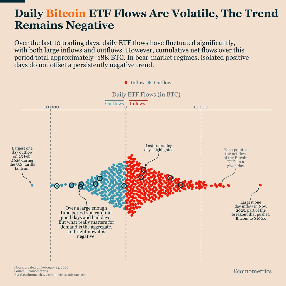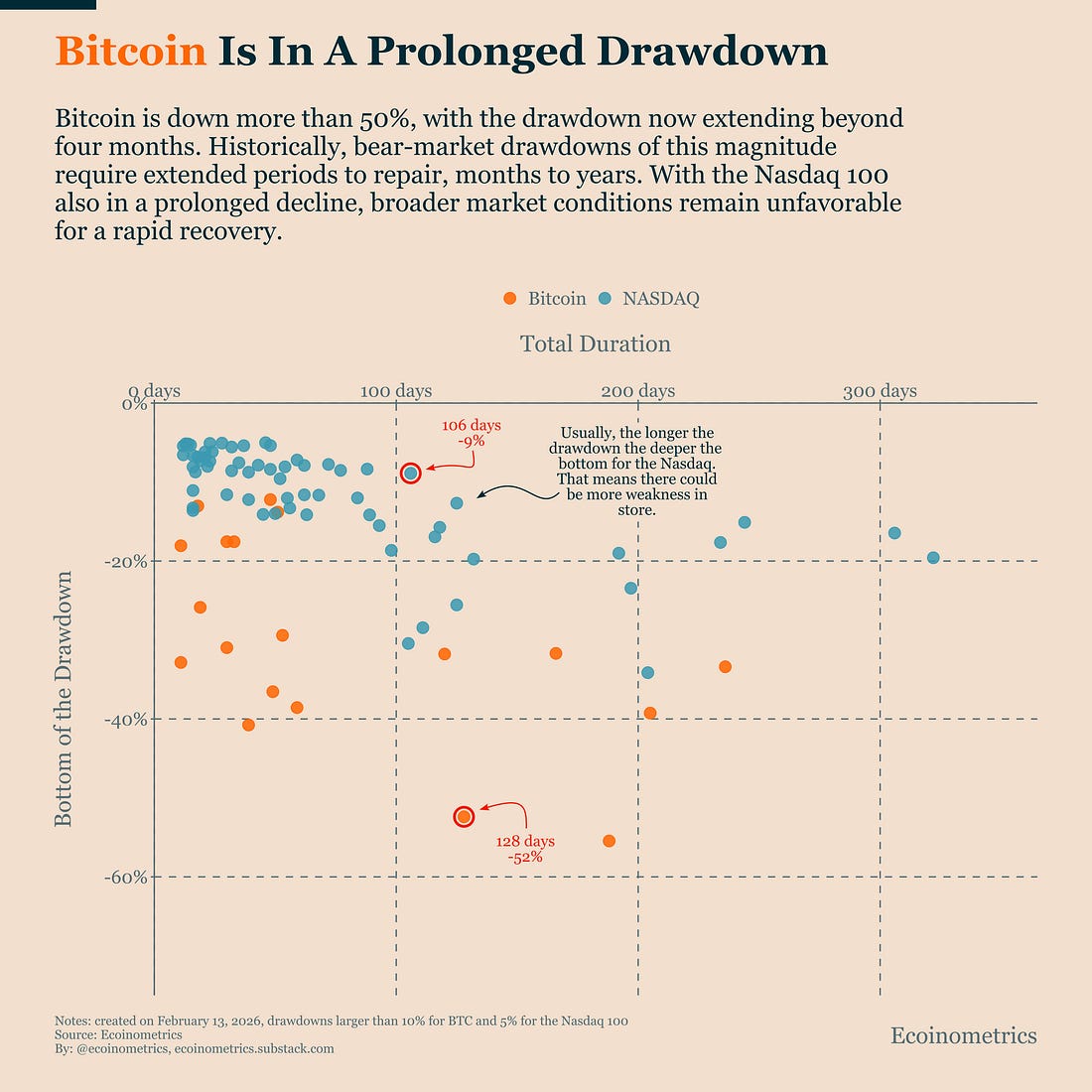 Nothing is breaking but nothing is improving fast enough either. Demand is weak, drawdowns are aging, and policy isn’t turning. That’s the regime we’re in. And it’s a slow moving one. In case you missed it, here are the other topics we covered this week: Get these professional-grade insights delivered to your inbox: Bitcoin Is A Patience Game Right NowIf there’s one lesson worth remembering in a bear market, it’s this: slow down. In bull markets, tops form quickly. Momentum reverses sharply. Trying to reduce exposure near a peak makes sense because the window is short. That’s hard to do, but at least that’s a game worth trying. Bear markets are different. They grind. They fluctuate. They give you good days just to remind you how it used to feel. But durable switch to a recovery phase don’t come out of nowhere. They take time to form. That’s why you need to look at things at the right scale. Take the ETF flows as an example. Over the last 10 trading days, we’ve seen both large inflows and large outflows. Some days look great. Others look ugly. If you zoom in, you can convince yourself something is changing. But when you zoom out just a little, the picture is clear. Cumulative net flows over the last 10 days are roughly –18,000 BTC. In other words, demand in aggregate remains negative. That’s all that matters. In bear-market regimes, isolated positive days don’t mark turning points. What changes regimes is sustained inflow i.e. persistent capital allocation, not a handful of positive clusters here and there. Until that trend shifts, volatility in the flows is just noise. That’s why you need to slow down, zoom out and be patient in this bear market. The turning point will emerge in the big picture for demand, not in the daily fluctuations of the price. Long Drawdowns Rarely End QuicklyNot all drawdowns are the same. Some corrections are sharp and short-lived. Others stretch out, grind lower, and take time to repair. The key difference isn’t just how deep they go, it’s how long they last. The chart below maps historical drawdowns by duration and depth for both Bitcoin and the Nasdaq 100. And there’s a pattern that shows up clearly: the longer a drawdown lasts, the deeper the correction. Bitcoin is now more than four months into its current drawdown, with price down over 50% from the October peak. That magnitude is not unusual by Bitcoin standards, but once a drawdown extends past the 100-day mark, history suggests recovery tends to be measured in months or sometimes years but not in weeks. The Nasdaq 100 is also entering longer-duration territory. And historically, when equity drawdowns stretch beyond three months, they often go deeper before stabilizing. That’s relevant for Bitcoin because it doesn’t operate in isolation, it is deep in the risk-on complex. In periods where U.S. growth stocks are under pressure, correlations actually tighten. And it is difficult to build a sustained recovery in a risk asset while the broader risk-on complex is still adjusting. Could this time be different? Always possible. But historically, when both duration and depth expand together, the probability of a quick v-shaped rebound declines. Your timeline for Bitcoin’s recovery needs to expand. The Economy Isn’t Weak... That’s Kind Of A ProblemThe stock market is one thing. The economy is something else. And for all the talk about a job apocalypse or an AI-driven labor collapse, the hard data simply doesn’t show an economy in distress. Yes, some companies are cutting staff. But most of that looks like normalization after the post-COVID hiring spree, not the start of a broad labor contraction caused by automation. And while inflation remains above target, it clearly hasn’t stopped consumers from spending. The chart below makes that clear, retail sales continue to grow along roughly the same expansion trend we’ve seen since the 1990s. COVID created a violent break (first down, then up) but once the distortion faded, the underlying growth trajectory resumed. This is not what recession looks like. There is no sustained rollover in consumption and no evidence that households have shut their wallets. And that’s where the paradox begins. Because if the economy isn’t cracking, the Fed has no macro pressure to rush into rate cuts. Housing is soft. Debt service costs are high. Government financing is expensive. But the core engine of the U.S. economy (household consumption) is still running. In a world where growth is stable but not accelerating, and policy is not easing, high valuations become harder to justify. Higher-for-longer rates mean future earnings are discounted more aggressively. And when business growth isn’t clearly re-accelerating, investors demand a higher risk premium. I’m not a stock analyst, I’m a macro guy, so I don’t want to dig into the details of why stock investors think valuations are too high. But clearly that combination (stable growth, no policy relief, rising uncertainty) is enough to pressure the risk-on complex. The Nasdaq 100 isn’t falling because the economy is collapsing. It’s adjusting to a regime where earnings growth isn’t strong enough to compensate for the neutral monetary policy. We are no longer in a zero interest rate world. So by the game of correlations, when equities are under pressure, Bitcoin feels it too. Bitcoin doesn’t trade in isolation. In periods where risk appetite compresses and correlations tighten Bitcoin is where investors reduce their risk exposure. So if we want to be a bit provocative about it, the issue isn’t that the economy is weak, it’s that it isn’t weak enough to justify lower rates. Tactical TakeawayBitcoin is not at a turning point and there is no sign yet that capital is reallocating back into risk. Trying to anticipate the bottom in a slow drawdown regime is usually expensive. Without sustained improvement in demand and broader risk appetite, rallies are unlikely to last (if 