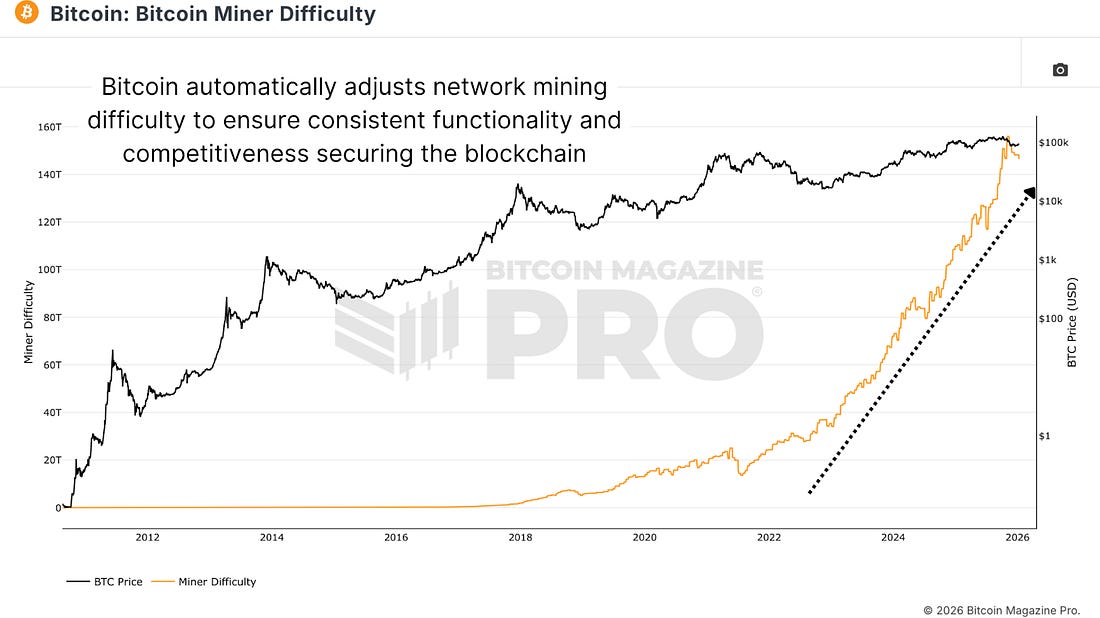 Bitcoin Mining Data & Network HealthLearn why crossings in 30-day vs. 60-day hash rate averages reveal real operational decisions by miners—and historically predict strong Bitcoin price recoveries.Bitcoin mining serves as the computational foundation securing the network while creating the economic incentives that drive Bitcoin’s monetary policy. By analyzing mining data, investors gain insights into miner confidence and network health that often exceed traditional sentiment analysis. These metrics, combined with user and derivatives data, provide a comprehensive picture of Bitcoin’s supply and demand dynamics. Mining & Block RewardsAround every 10 minutes, a new Bitcoin block containing validated transactions is mined. These blocks are stored on Bitcoin’s blockchain, its public ledger that records details of every transaction that has occurred on the platform. We typically refer to activities related to the blockchain as being “on-chain”. Miners compete using specialized computer processing units to solve mathematical problems proving block validity. The miner who successfully solves the block receives a significant reward, creating intense competition reflected in exponentially increasing Bitcoin Miner Difficulty rate (the number of hashes required to find a valid block solution), throughout Bitcoin’s history. Figure 1: The exponential rise in Bitcoin Miner Difficulty. Despite exponential increases in computational power, Bitcoin maintains 10-minute block intervals through difficulty adjustment mechanisms. Every 2016 blocks, approximately every 2 weeks, Bitcoin adjusts mining difficulty based on network hash rate. If the hash rate increases, the difficulty increases proportionally. If the hash rate decreases, the difficulty decreases. This ensures block times remain consistent despite computational power fluctuations. The Halving EventEvery 210,000 blocks, the miner block reward decreases by 50% through the Bitcoin halving event. In Bitcoin’s first epoch, miners received 50 Bitcoin per block. After another 210,000 blocks, this decreased to 25 Bitcoin. Then to 12.5 Bitcoin. Today, miners receive 3.125 Bitcoin per block. This predetermined halving schedule means Bitcoin’s inflation rate can be accurately calculated indefinitely. The next halving will occur when the block reward drops to 1.5625 Bitcoin, continuing until 2140 when block rewards reach zero. Figure 2: The impact of halving events on Bitcoin Miner Revenue. Miners also earn revenue from transaction fees, creating total revenue combining block subsidies and fees. During Bitcoin bull markets and congestion periods, transaction fee spikes can exceed block reward revenues, sometimes surpassing thousands of Bitcoin per day or millions of dollars earned by miners collectively. These fee spikes provide additional insight into on-chain activity and network utilization. The Puell MultipleThe Puell Multiple measures aggregated Bitcoin miner revenue in USD-denominated terms and divides it by yearly rolling averages. When the Puell multiple increases significantly, miners are earning substantially more Bitcoin than historical averages, suggesting potential market overheating. This usually occurs when more miners enter the network, trying to capitalize on rising prices, and more people use Bitcoin, generating higher transaction fees. Figure 3: The Puell Multiple uses miner revenues relative to their yearly rolling averages to assess market conditions. Conversely, when the Puell Multiple decreases substantially, usually fewer miners are mining, the hash rate is declining, difficulty is declining, and on-chain activity is decreasing. Miner earnings compared to previous yearly averages decrease dramatically. These periods provide clear buy and sell signals for Bitcoin price action. The Puell Multiple also illuminates the impact of halving events, where miner revenue drops approximately 50% practically instantly following the 210,000 block interval. Hash RibbonsThe Hash Ribbons Indicator compares the 30-day average hash rate against the 60-day average hash rate. When the 30-day line crosses below the 60-day line, the background turns red, indicating miners are becoming bearish and turning off machines. This is not sentiment analysis but actual operational decisions by multi-million dollar mining operations and huge public companies that must take price expectations seriously. Figure 4: The Hash Rate Ribbons Indicator provides valuable insight into the economics of mining operations. When the 30-day line crosses back above the 60-day line, the background turns white, and historically, this has marked some of the most reliable signals of upcoming bullish Bitcoin price action. Throughout recent years, hash ribbons have marked Bitcoin’s bullish periods with remarkable accuracy. This metric reflects genuine operational decisions based on expected profitability rather than emotional sentiment, making it a powerful leading indicator for price direction. ConclusionThe metrics discussed in this article are entirely free on Bitcoin Magazine Pro. Understanding these metrics enables more accurate dollar-cost averaging strategies, better timing of accumulation and distribution, and clearer comprehension of Bitcoin’s supply and demand dynamics. For access to a wider range of charts, CSV data downloads, API access, real-time alerts, and more, consider becoming one of our many site subscribers. For a more in-depth look into this topic, watch our most recent YouTube video here: Bitcoin Masterclass #3 | Mining & Network Analysis Matt Crosby Director of Research & Analytics Bitcoin Magazine ProFor more detailed Bitcoin analysis and to access advanced features like live charts, personalized indicator alerts, and in-depth industry reports, check out Bitcoin Magazine Pro. Make Smarter Decisions About Bitcoin. Join millions of investors who get clarity about Bitcoin using data analytics you can’t get anywhere else. We don’t just provide dat