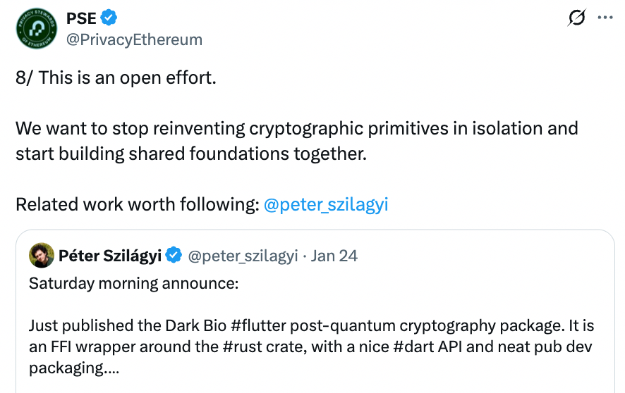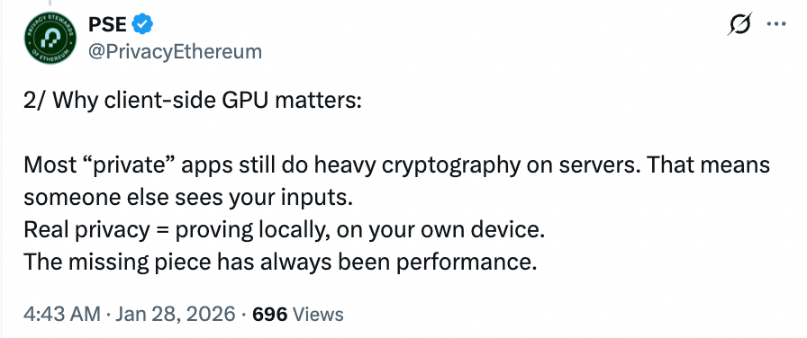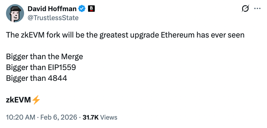 Each upgrade has made material progress recently, with 2026 poised to be the year they get delivered! Here's where each stands and how they fit together for a brighter future for Ethereum and the world. Shipping the zkEVMThe ecosystem is still digesting Vitalik's recent declaration that rollup-centrism "no longer makes sense." But if rollups are no longer Ethereum's north star, what is? As our very own David Hoffman recently wrote, the answer is clear: it's the zkEVM. In January, Tomasz Stańczak published the Ethereum Foundation's zkEVM roadmap for bringing zero-knowledge proofs to L1 block validation, targeting this year to tackle its core infrastructure. Today, when validators check that a block is valid, they re-execute every transaction themselves, doing the same work the block producer already did, thousands of times over across the network. It's a fundamentally inefficient process that constrains every blockchain, even Solana. The zkEVM changes this: instead of re-executing, validators would verify a cryptographic proof confirming the block was processed correctly. The same confidence with far less work. This effectively turns the L1 into a ZK rollup – the very thing Ethereum spent years building externally via L2s, now internalized. The user impact is direct: with proof verification far cheaper than re-execution, Ethereum gains the room to aggressively raise gas limits, meaning lower fees and faster transactions on the L1 itself. That's an order-of-magnitude scalability upgrade targeting the thing that users have wanted most. Ironically, the rollup-centric era helped get us here. Years of investment in ZK proving systems, originally built for L2s, accelerated zkEVM progress far beyond expectations, bringing what was once Ethereum's most distant ambition within striking distance. The Ethereum Foundation (EF) is now working across six sub-projects to make this happen, from building the data packages provers need, ensuring multiple independent proving systems (SP1, RISC Zero, Jolt) are compatible with different Ethereum clients, and integrating proof verification directly into the consensus layer. The heaviest lift is work on the prover infrastructure itself, since generating ZK proofs requires serious GPU power and will operate as its own standalone layer. Alongside all of this, the EF is benchmarking performance and hardening security before anything goes live. One dependency worth flagging: real-time proving needs more breathing room than validators currently have between producing a block and confirming it. The Glamsterdam hard fork in mid-2026 will widen that window, which is why it's a key milestone on the zkEVM timeline. Bringing Post-Quantum Security to EthereumQuantum concerns are ramping up across the industry – and it's not just a concern for Bitcoin. Justin Drake announced a dedicated post-quantum (PQ) team led by cryptography engineer Thomas Coratger, with bi-weekly core dev calls run by Joseph Asano that kicked off earlier this month. Two $1M bounty programs signal its priority: the Poseidon Prize rewards cryptographers who find vulnerabilities in the Poseidon hash function, and the Proximity Prize incentivizes improvements to ZK proof verification. Multi-client PQ devnets are already live. At its core, the threat is that quantum computers could break the signature schemes securing wallets today, and that our adversaries may already be recording blockchain data to crack later as those machines mature. For a permanent public ledger, that makes the migration timeline urgent. On the solutions front, two leading replacement standards, Falcon (EIP-8052) and Dilithium (EIP-8051) exist in draft EIP form. Both use math that quantum computers can't crack, but differ in tradeoffs around signature size and implementation complexity. The EF isn't forcing a choice between them. Instead, the first PQ dev call emphasized "cryptographic agility" as a design goal, building Ethereum to support multiple signature schemes at once and swap them over time. Account Abstraction already enables this: a working demo on that call showed post-quantum transaction signatures are already possible today. While post-quantum security protects signatures at the network level, a parallel effort focuses on a different kind of protection: keeping user data private in the first place. Client-Side Proving to Turbocharge User PrivacyMost ZK applications generate proofs on remote servers, undermining privacy if your inputs are visible to that server. As Vitalik famously put it, "Privacy is not a feature, but hygiene." True privacy requires proofs generated on your own device. Why don't we have this yet? Consumer devices haven't had the power, and no standard tooling existed. That's changing. Modern phone and laptop GPUs are now capable, and post-quantum ZK proofs are far more efficient to generate on these devices. Benchmarks from the EF's Privacy and Scaling Explorations team show how big the opportunity is – on Apple's latest chips, running post-quantum ZK schemes can actually unlock performance gains, not just enhanced security. What's the holdup then? Most development still targets the older, quantum-vulnerable approach, which won't hold up long-term. And every project building client-side proving is reinventing the wheel since no shared toolkit exists yet. The PSE team's roadmap aims to fix both, building common tools that the whole ecosystem can use. What Comes NextThese three tracks all feed into the same overarching vision. Last July, EF researcher Justin Drake unveiled lean Ethereum, a proposed roadmap for the next decade that reimagines Ethereum's core layers from first principles. The goal: make Ethereum faster, simpler, and hardened against anything – quantum computers, nation-states, whatever comes calling. The zkEVM, post-quantum migration, and client-side proving are each building toward that foundation. And because all three share the same cryptographic building blocks, progress compoun
