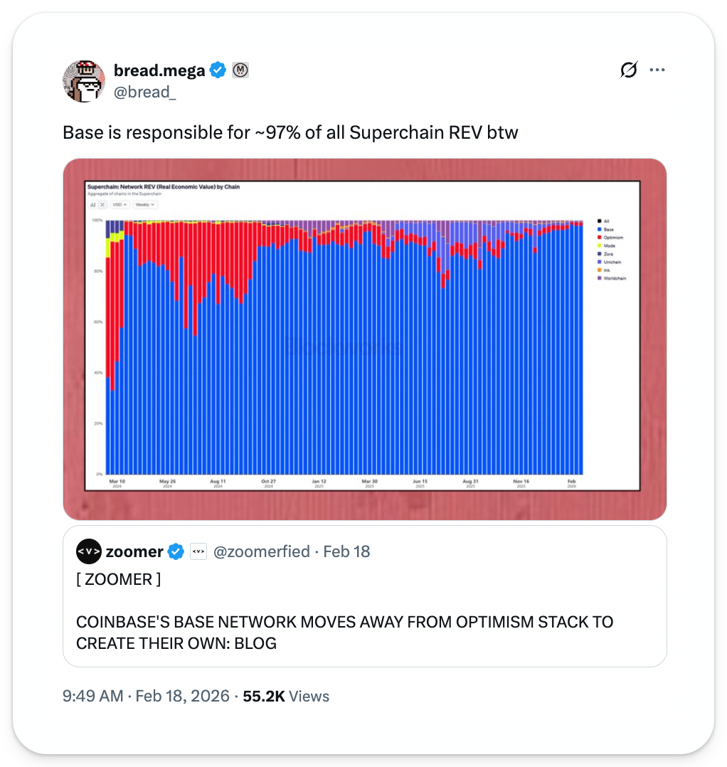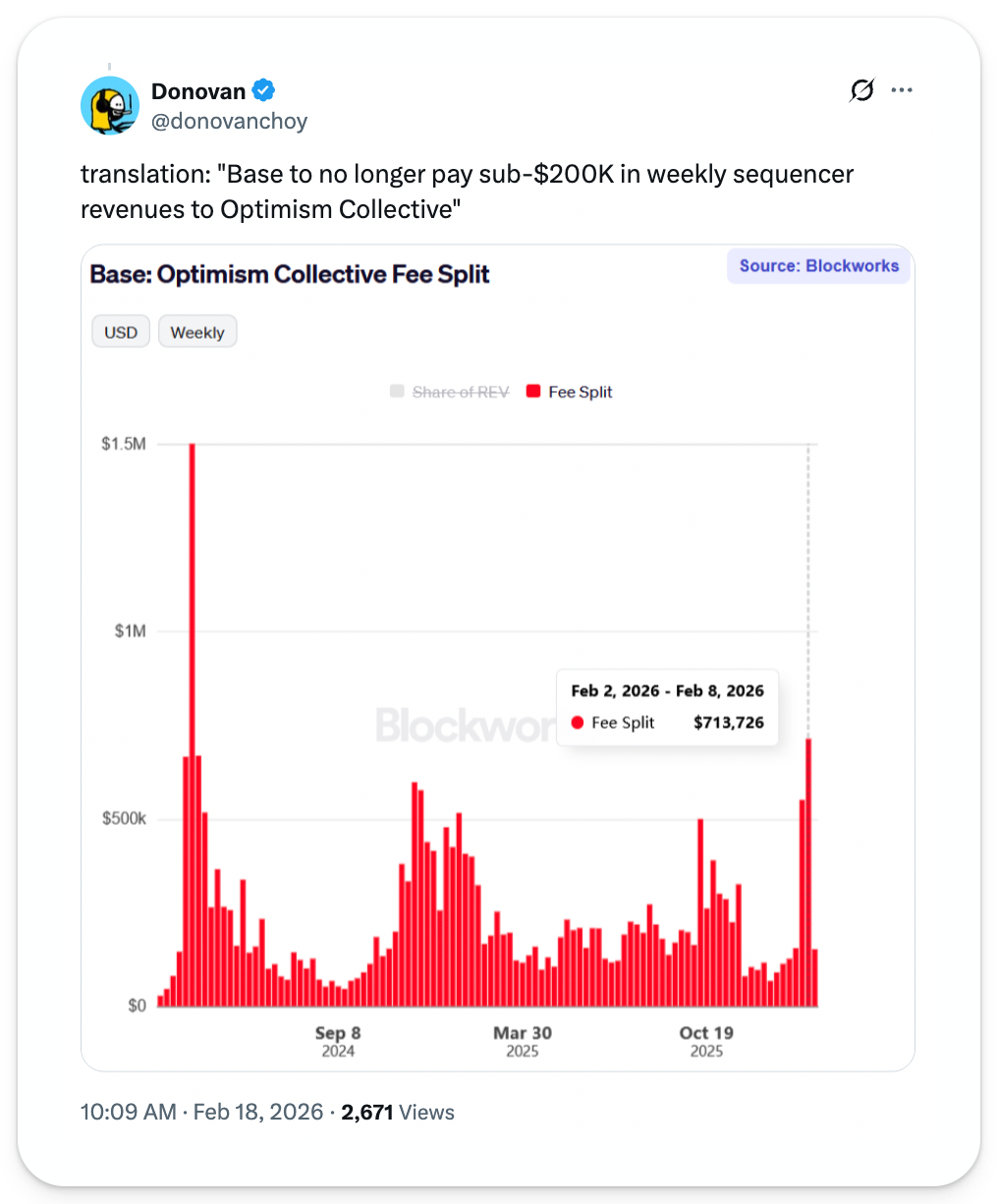 📸 Daily Market Snapshot: Tariff news still couldn't push ETH back above $2,000 on Friday, as crypto prices seemed to have a more muted reaction to the Supreme Court's tariff news than other high-growth assets. | Prices as of 4pm ET | 24hr | 7d | | Crypto $2.32T | ↗ 1.0% | ↘ 2.3% | | BTC $67,722 | ↗ 1.0% | ↘ 1.8% | | ETH $1,970 | ↗ 1.2% | ↘ 4.1% | . . . ANALYSIS Optimism's Ugly Year The past year left Ethereum L2 Optimism bloodied and battered, and 2026 continues to twist the knife. For a network once positioned as crypto’s scaling endgame, the reversal has been swift and unforgiving – what went wrong? In 2024, the Optimism “Superchain” was riding high, crowned as the clear victor among L2 scaling efforts after securing integrations from the industry's hottest upstart L2s that appeared to permanently cement its status as crypto’s dominant scaling framework. As ecosystem momentum turned sluggish throughout 2025, OP Stack-related growth metrics grew unilaterally tied to Base's success. In the meantime, OP investors faced brutal losses – after more steep losses this week, the token is down 97% from its March 2024 ATH. Now with Base announcing that they're leaving the OP Stack, we’re unpacking Optimism’s dilemma and exploring how it can compete in a new era of crypto. Optimism’s DilemmaEarlier this week, Coinbase announced it will abandon Optimism's OP Stack, the Ethereum L2 framework that has powered Base Chain for more than three years. In its place comes the new “unified stack.” Effectively, this means forking the open-source OP Stack code base into the Coinbase-controlled base/base GitHub repository and developing it in a segregated environment from the broader Optimism ecosystem. While the OP Stack initially promised to supercharge technical progress by aligning multiple core development groups (i.e.; Optimism and Base) to work toward the same goal, the Base Engineering Team now argues that code isolation will allow it to accelerate development progress by reducing unnecessary communication. Coinbase’s abrupt and unexpected departure from the OP Stack standard represents a meaningful blow to the Optimism ecosystem. For years, Base was held up as proof that the OP Stack model worked: a major U.S. exchange was developing shared infrastructure, contributing revenue back to Superchain, and validating Optimism as Ethereum’s scaling endgame. Now, that symbolic alignment is fractured. Although Coinbase’s unified stack is affixed with an MIT License – meaning it can be freely used, modified, sublicensed, and sold by anyone (including Optimism) – the announcement has triggered immense concern for the future of the Superchain Collective. While the collective includes other high-flying participants like Unichain, World Chain, and Kraken's Ink – the group's public goods fund currently receives an all-time high 97% of its funding from Base. What Comes Next?OP Mainnet – once a mainstay Ethereum L2 for social and trading applications – has long been supplanted by flashier alternatives, like Hyperliquid. Meanwhile, the promised Superchain vision didn't materialize as imagined in its heyday; native interoperability remains non-existent, and no chain besides Base generated sustained traction. Still, while it has certainly been a brutal week for Optimism's team and the OP token, the ecosystem is continuing to pursue new partnerships and growth avenues. On the same day Base abandoned Optimism, Ethereum restaking manager and onchain neobank ether.fi announced plans to migrate "~70,000 active cards, ~300,000 accounts, and millions in user TVL," to OP Mainnet over the coming months. It's been a tough year for OP, but down-bad crypto projects have a habit of bouncing back when even the most modest tidbit of good news is sufficient to fuel a relief rally. Despite the major headwinds facing Optimism, it may be unwise to write off OP investments at this very moment. FRIEND & SPONSOR: READY (FORMERLY ARGENT) Ready makes going bankless simple. Pay with USDC worldwide with zero FX fees and earn up to 3% cashback. Start spending instantly with a virtual card and choose between a free or paid plan. Keep control of your assets. Bankless readers get 20% off Metal with code BANKLESS20 |