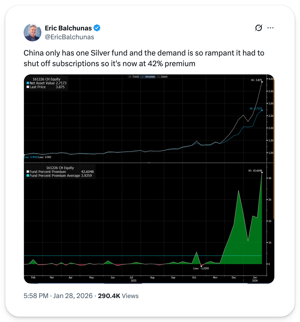 📸 Daily Market Snapshot: Crypto prices spent much of Monday recovering from scary overnight lows. ETH fell to $2,150, BTC touched $74,500, and SOL fell below $100 for the first time in two years. | Prices as of 6pm ET | 24hr | 7d | | Crypto $2.65T | ↗ 1.6% | ↘ 13.0% | | BTC $78,489 | ↗ 1.2% | ↘ 10.9% | | ETH $2,331 | ↗ 1.9% | ↘ 20.1% | . . . ANALYSIS Unpacking a Brutal Weekend for ETH, BTC, and Gold In a grim bit of irony, the very day Binance published its long-awaited postmortem on the record-setting 10/10 liquidations, crypto investors were subjected to another brutal flash crash. On Friday, BTC broke down into the low 70s, dropping below MicroStrategy's cost basis of $76K. ETH dropped below $2K, shedding over 13% in a single day. More than $2.5B in leveraged positions were wiped out. If you were locked into Twitter over the weekend, you'll know crypto was by no means the only asset class that suffered. Gold and silver saw historic volatility, with silver posting one of its largest single-day drops in 275 years. When selling strikes several asset classes at once, it often points to something broader. Here it appears to be institutions pulling back from risk across the board, particularly in markets that had grown dangerously leveraged over the preceding months. Crypto, as usual, was leading the way down. Here's what went down👇 New Blood at The FedLate Thursday, prediction market Polymarket leaked confirmation that Kevin Warsh would be the next Federal Reserve Chair, with Trump confirming the appointment the next morning. Markets reacted immediately — and harshly. Warsh built his reputation as a "hard money" advocate during his time at the Fed in the late 2000s, calling for the central bank to shrink its balance sheet and tighten policy after the financial crisis. That reputation spooked investors, who started pricing in the possibility of higher interest rates and tighter monetary policy under his leadership. But context matters here, and there's reason to think markets overreacted. Warsh's hawkish stance came when he wasn't actually in charge. Now, Warsh will be entering the Fed against the backdrop of Trump's constant meddling in monetary policy. Warsh, who early reports have said had long been gunning for the Reserve's top job, appears to have wooed the President by very publicly airing disapproval of Powell's rate cut skittishness.  A WSJ Op-Ed penned by Warsh on how AI will improve productivity and reduce inflation. Powell's reluctance to cut rates obviously has earned the ire of the White House, and Trump and his administration have indicated a pivot toward more quickly lowering interest rates to crank the AI boom into hypergrowth. Two weeks ago, Treasury Secretary Bessent said he wants the new Fed chair to be a "supporter" of the AI productivity boom – i.e., someone willing to let the economy run hot. The Warsh news didn't land in a vacuum. A partial U.S. government shutdown added to the risk-off mood, even if it appeared to be quickly resolved. Meanwhile, reports of an explosion at Iran's Bandar Abbas port raised geopolitical tensions. Combined with uncertainty around the new Fed chair, these factors created the conditions for a broad sell-off. Investors didn't wait to sort out what mattered most — they just hit the sell button. While crypto grabbed some headlines, the real historic action was in precious metals. Silver's single-day drop last Friday ranks among the largest in its recorded market history. At the same time, gold volatility spiked to levels only seen during the 2008 financial crisis and the COVID crash in March 2020. Leveraged funds and crowded options positioning turned what could have been an orderly pullback into an explosive and historic drop. To understand why metals have been so volatile, you have to understand China's role in the rally that preceded this crash. Chinese investors have been a major force behind the gold and silver rally over the past year. With the country's property market still in free fall and the banking system sitting on hidden losses, wealthy households have been looking for ways to protect their savings. Gold and silver fit the bill — especially since access to Bitcoin is heavily restricted onshore. It's worth zooming out to see just how significant Chinese demand has become here. China's economy is roughly two-thirds the size of the U.S., yet its central bank holds far less gold — only about 10% of its reserves are in gold, compared to 80% for the United States. That gap has been closing fast. According to charts shared by Capriole Investments, over the past two years, China's gold reserves have increased nearly tenfold as the country has gone on a buying spree. The demand isn't coming from the government alone. The numbers tell the story at the retail level too. Silver in China had been trading at a 42% premium over international prices. As Alex Campbell framed it: "If you're a rich Chinese household, do you want more money in a zombie banking system with trillions of hidden losses? Or are you okay buying physical silver at elevated levels and risking a drawdown?" For months the pattern held that New York would sell, Shanghai would buy, and prices would recover. Western sellers would take profits, and Chinese demand would absorb the supply. That pattern broke on Friday. When China opened, instead of buying the dip, investors there sold gold in size. The local Chinese silver ETF was halted. The rescue bid that Western bulls had come to rely on simply didn't show up. Without that backstop, prices fell through the floor. Bitcoin Outflows AccelerateBack in crypto, the damage was severe. U.S. spot bitcoin ETFs — our dearly regulated investment vehicles supposed to bring steady institutional demand — saw roughly $1.49B exit during the final week of January. Thursday's $818M outflow was the largest single-day redemption of 2026. For the full month, bitcoin ETFs lost approximately $1.6B, making January the th