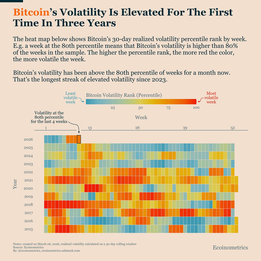 Bitcoin Volatility Has Spiked AgainIn the big picture, Bitcoin has become significantly less volatile than it was in previous cycles. That is largely the result of the market maturing. Institutional investors now dominate trading activity, and Bitcoin increasingly behaves like a high-beta component of the broader risk-asset universe rather than a niche speculative asset. But lower structural volatility does not mean volatility disappears. It just means spikes become less frequent and less extreme. And right now we are experiencing one of those spikes. The heatmap below shows Bitcoin’s weekly volatility ranked against the past ten years of market history. A week in the 80th percentile means volatility was higher than 80% of all weeks in the sample. For the past four weeks, Bitcoin has been consistently at that threshold. That is the longest streak of elevated volatility since 2023. Now why does this observation matter in the current environment? Well it matters because volatility is the enemy of signal. When price moves too quickly, whether up or down, markets tend to overreact relative to the underlying structural forces driving the trend. During these periods, price swings often say more about positioning and sentiment than about fundamentals. That’s important to keep in mind when looking at Bitcoin’s recent moves. The rebound above $70K might look meaningful at first glance. But in a high-volatility environment, those price swings can simply reflect noise rather than a genuine change in market structure. In fact, most of the recent moves remain broadly consistent with the expected price range implied by ETF flows. Which means the real signal is still the same as what we discuss in the previous section: demand is improving but it is still fragile. So what matters most is not whether Bitcoin briefly trades at $65K or $70K. What matters is whether sustained demand returns to the market.