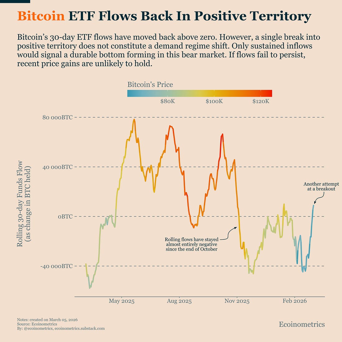 Markets have been volatile this week. Bitcoin pushed back above $70K while macro headlines continue to shift the narrative around risk assets. To get a clearer picture of what is actually changing in the market, we look at three signals that matter right now. In case you missed it, here are the other topics we covered this week: Get these professional-grade insights delivered to your inbox: Bitcoin ETF Flows Turn Positive AgainBitcoin’s rolling ETF flows have been negative almost continuously since November. That persistent demand drain has been one of the main forces behind the bear market we have been tracking over the past few months. Now we are seeing another attempt at a reversal. Rolling flows have just moved back into positive territory. The last time that happened was a little over a month ago. But that breakout only lasted a few days before outflows accelerated again. So the key question now is whether this time is different. It’s worth noting that the recovery in flows actually started before the escalation of the conflict with Iran. And the fact that equity markets have not entered a full risk-off phase has helped Bitcoin avoid giving back those gains. That’s how we ended up with Bitcoin briefly pushing back above $70K this week. But rallies happen all the time during bear markets. What matters is whether they are supported by sustained structural demand. Right now the structural force that matters most is ETF demand. Since the launch of spot ETFs, flows have become the dominant marginal driver of Bitcoin’s price. When capital moves into the funds, price tends to follow. When flows turn negative, Bitcoin usually struggles. That’s why the rolling 30-day flow regime is so important. A single move back above zero does not mean the demand regime has shifted. What we would need to see is persistent inflows over multiple weeks. Our ETF flow simulations in Wednesday’s report still do not show a clear regime change yet. The odds of a demand recovery have improved compared to last month, but they still don’t favour a sustained recovery. So for now, ETF flows remain the key variable to watch.
