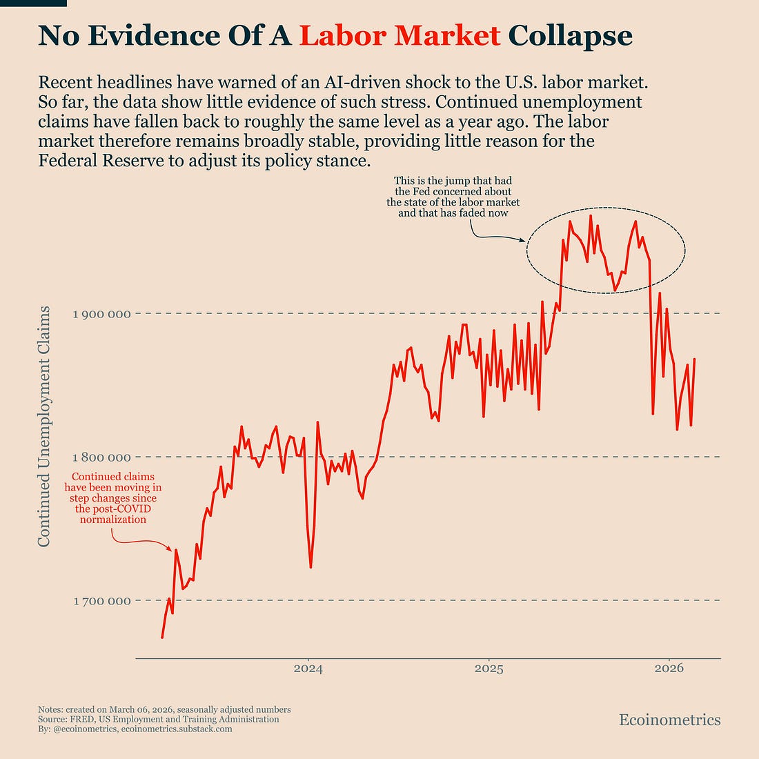 No Evidence Of A Labor Market CollapseOne of the main reasons the Federal Reserve delivered a few modest rate cuts toward the end of last year was growing concern about the labor market. At the time, the narrative was driven by two things. First, the data. Among other things, continued unemployment claims began to rise, suggesting that people who lost their jobs were taking longer to find new ones. That raised concerns that the labor market might be weakening. Second, the narrative. The hype around AI created a wave of speculation that automation could soon replace large numbers of white-collar jobs. Together, those two forces created the impression that a labor market shock might be underway. But that’s not what actually happened. If you look at the data in the chart below, the spike in continued unemployment claims turned out to be just that, a spike. The increase has now fully faded, and claims are back to roughly the same levels they were averaging a year ago. In other words, the labor market has not collapsed. It has simply normalized after the post-COVID adjustment period. And despite all the headlines about AI replacing workers, there is still very little evidence of that happening at a meaningful scale in the macro data. What this means for markets is straightforward. When the Fed evaluates its dual mandate, it has to balance two risks: inflation running too hot and the labor market weakening too much. Right now the labor side of that equation looks broadly stable. Inflation, however, remains much more uncertain. That shifts the balance of risk toward maintaining a restrictive policy stance rather than rushing into another round of rate cuts. And that matters for Bitcoin and other growth-sensitive assets, because it means monetary policy relief is unlikely to arrive any time soon.