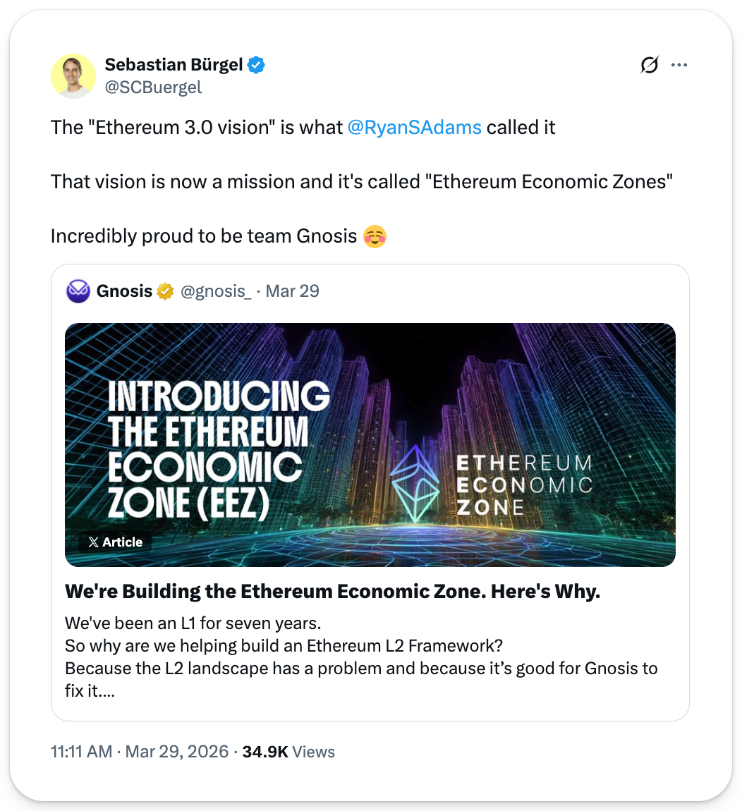 📸 Daily Market Snapshot: It was a mixed day for markets as investors held their breath on Trump's threatened ground invasion in Iran. Meanwhile, oil futures spiked 5% today -- up 47% this month. | Prices as of 5pm ET | 24hr | 7d | | Crypto $2.31T | ↗ 0.6% | ↘ 5.7% | | BTC $66,789 | ↗ 0.3% | ↘ 5.8% | | ETH $2,040 | ↗ 1.8% | ↘ 5.5% | . . . ANALYSIS What's the Ethereum Economic Zone? This year's EthCC event in Cannes has fielded its first major announcement: the Ethereum Economic Zone. Led by the Gnosis and ZisK teams and with funding from the Ethereum Foundation, this new effort is aimed at ending fragmentation in the Ethereum ecosystem for good, so let's dig into what's being proposed. How We Got HereL2s were meant to extend Ethereum blockspace, and they have. Alongside this expansion, L2s have seen fragmented liquidity. Your coins on Arbitrum or Base or Polygon can't readily interact with contracts on the L1 or other L2s without being bridged over, which costs money and time. Of course, this isn't some new diagnosis. At Devcon SEA in late 2024, Gnosis co-founder Martin Köppelmann gave a talk called "Ethereum Needs Native L2," highlighting the range of trust assumptions that hamper interoperability among L2s. In response, he called for ZK-proven rollups that can synchronously read and write across each other and Ethereum. At the time, our very own Ryan Sean Adams hailed this concept as the "Ethereum 3.0 vision." Now, the Ethereum Economic Zone project is officially taking up the mantle of this vision and preparing to bring it to fruition. And while, to be sure, Köppelmann was calling for Ethereum-native rollups literally, the EEZ approach is downstream of his 2024 diagnosis and is aimed at actualizing a broader and more permissionless approach. EEZ rollups can be native and based, or external and not based; it will just depend on their architectural choices. Who's Building the EEZGnosis is the quiet development juggernaut that has created iconic onchain infra like CoW Protocol, Safe multisigs, the Zodiac DAO architecture, the Conditional Tokens format underpinning Polymarket predictions, Gnosis Chain, Gnosis Pay, etc. On the ZK side, ZisK, spearheaded by Jordi Baylina, has innovated an efficient and open-source zkVM design that can bring real-time proving to the execution of Ethereum ecosystem smart contracts. Importantly, though, neither Gnosis nor ZisK or any other entity "owns" the EEZ stack; the Ethereum Foundation is funding this initiative "as shared Ethereum infrastructure that is credibly neutral," and its results will be free and open source for all. How the EEZ Will WorkSimply put, the Ethereum Economic Zone is an L1-L2 framework centered around synchronous composability, i.e. real-time interoperability. In other words, rollups plugged into the EEZ will be able to call contracts on the L1 or other L2s and receive a response in a single transaction. This will power atomic executions across chains so that it will feel like you're just using a single chain. In this sense, contracts on EEZ chains will work as if they did in fact live on the same chain. Transactions will complete atomically across the relevant networks, or not fire at all in the case of some error. From Baylina's previous research, we can infer the anchors here will be proxy smart contracts, i.e. when a contract deployed on one chain represents a contract living on another chain. If you're on Ethereum you'd just call a proxy – the proxy would handle the transaction and apply the state changes to the given L2, and voila. And perhaps most notably, this "single chain UX, multichain results" shift can and will be implemented without Ethereum having to make any protocol-level changes, as the EEZ will depend on smart contracts + real-time ZK proving. All that said, the main tradeoff L2s will have to accept in opting into this EEZ system is having to re-org when Ethereum re-orgs, as Martin Köppelmann has noted. That would be a technical thorn but hardly some major pain point. Rollups running their own sequencers would need to accommodate this coupling, which is certainly possible. Why It MattersImagine an Aave position on Ethereum interacting with a Uniswap pool on Unichain (or a Morpho vault on Base, or a Fluid vault on Arbitrum, etc.) in a single transaction without bridging. That's the future that the EEZ project is working to usher in. And while there are still some hardware and proving strides to be made before this vision fully matures, we're on the verge of the needed breakthroughs. The payoff should be more consolidation and dominance for Ethereum. As RSA put it: "If Ethereum pulls this off—if it unites its chains into an integrated economic zone—while shipping quantum upgrades and L1 scaling of Lean Ethereum in parallel...
