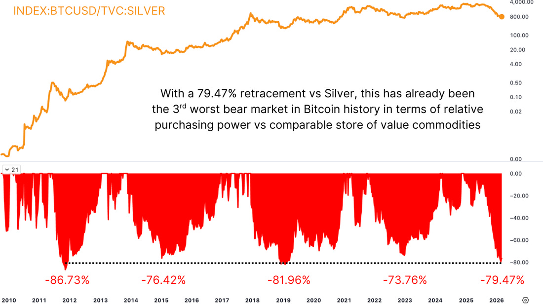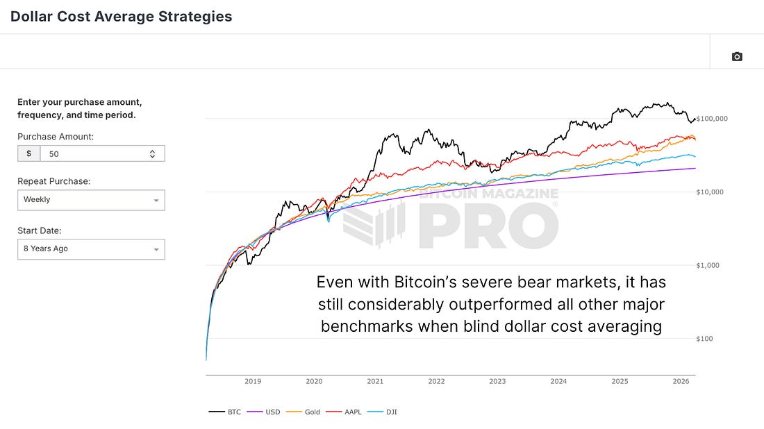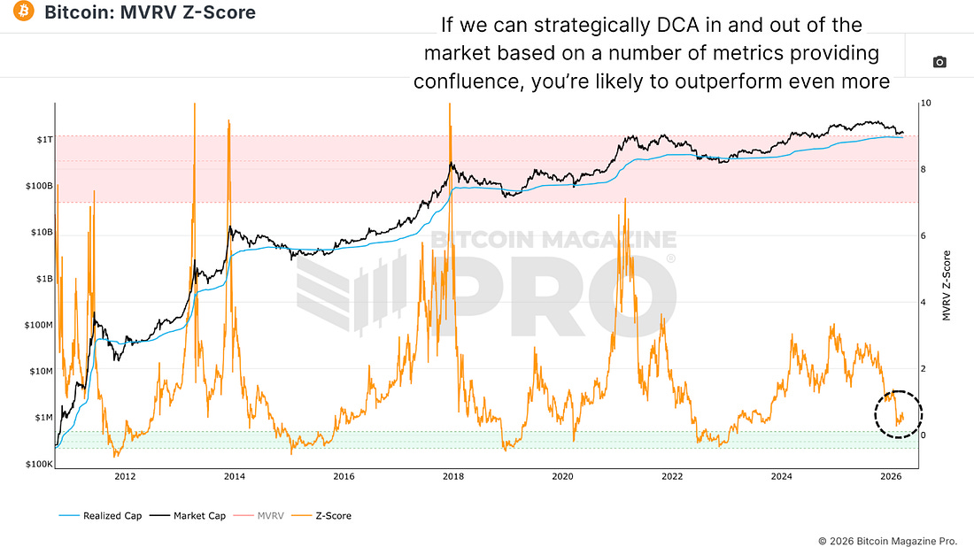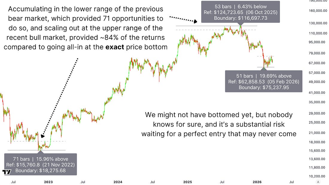 Stop Trying To Buy The Exact Bitcoin BottomFrom MVRV to ATR ranges, the evidence points to wide accumulation windows—not single price targets.Let’s talk about something that’s been frustrating me a little lately. The comments, the messages, the social media threads, all variations of the same thing. “I’m waiting for the CVDD.” “I’m not buying until we hit the 200-week moving average.” “I’ll go all-in at exactly $x.” Stop it. Not because those levels aren’t worth watching, they are, and we’ve covered them in depth. But this kind of thinking, waiting for one precise number before doing anything, is how people end up either missing the bottom entirely or convincing themselves to stay on the sidelines while the market quietly turns. Investing isn’t binary. Analysis is probabilistic. And the data, when you look at it properly, makes a compelling case that thinking in exact price targets is the wrong framework entirely. Dollar-Cost Averaging Dollar Cost Average Strategies get talked about so often that it’s almost become background noise. But it’s worth actually looking at what it has delivered, because the numbers for this baseline strategy are genuinely remarkable. Cast your mind back eight years. Bitcoin was around $9,000 and around a 50% retracement from the peak, maybe not too dissimilar to where we are now. If you had simply started dollar-cost averaging from that point, buying consistently through every swing, every panic, every “this time it’s different” headline, the outcome would have been extraordinary. Massively outperforming equities and even gold over a period when gold itself went exponential. The ups and downs, the turbulence and the chop, none of it changed the outcome meaningfully, because the strategy never required you to be right on any single day. Figure 1: A dollar-cost averaging strategy with Bitcoin has outperformed other asset classes over an 8-year period. The Data Says… The MVRV Z-Score compares Bitcoin’s current market value to the aggregate cost basis of every coin in circulation, then standardises that against Bitcoin’s historical volatility. In plain terms, it tells you how far the current price sits from what the average Bitcoin investor paid. When that gap closes to near zero, or goes negative, it has historically marked genuine capitulation territory, the kind where the majority of the market is sitting at a loss and selling pressure begins to exhaust itself. Figure 2: The reliable MVRV Z-Score adds strategic weight to a simple DCA approach. Right now, we’re not at those extreme readings, but we’re not far from them either. The data suggests we’re considerably closer to a bottom than to a cycle top. That’s not a guarantee; markets can always push further in either direction, but as a probabilistic statement, the on-chain evidence indicates that accumulation at current levels is more than rational compared to waiting on the sidelines. Measuring Against Commodities If you measure Bitcoin not against the US dollar, a currency that loses purchasing power every year, but against a comparable asset that people actually rotate capital between, you get a more honest picture of where we stand. The Bitcoin-to-silver ratio is one of the more instructive ways to do this. Silver is a genuinely comparable target in terms of the market cap Bitcoin could realistically challenge within the next cycle or two, and the next obvious target before going for gold, making it a cleaner benchmark than gold at its current scale. Figure 3: Measured in terms of silver, Bitcoin’s current retracement ranks amongst the worst. By this measure, the current drawdown already ranks as one of the worst bear markets in Bitcoin’s history in relative terms. That context matters because it tells you something about where we are in the cycle beyond just the dollar price. The Data On Perfect Timing A couple of years ago, I ran an analysis across the entire Bitcoin blockchain; every active wallet, every address that had accumulated and spent Bitcoin across a full market cycle. The question was straightforward: how many wallets actually managed to buy the cycle low and sell the cycle high? The answer was one. A single wallet. Out of every Bitcoin address on the network, 0.000016% managed to execute that perfectly, buying at the 2018 bear market lows and selling at the 2021 bull market peak. Let me know if you think it’s worth running the analysis again for the most recent cycle! Figure 4: Only one wallet managed to buy at precisely the 2018 bear market low and sell at the 2021 bull market peak. You’re not going to be that wallet. Neither am I. And more importantly, trying to be is an active risk; it’s what keeps people in cash through an entire accumulation window waiting for a number that may never come, or comes and goes in hours while they deliberate. Where The Real Opportunity Lives So if perfect timing is essentially impossible, what’s the actual framework? The Average True Range (ATR) analysis answers this directly. Rather than measuring cycle lows and highs in fixed percentage terms, which gets distorted as Bitcoin’s volatility diminishes over successive cycles, the ATR approach scales with how volatile the asset actually is at any given moment in its history. It defines a realistic accumulation zone around a cycle low and a realistic distribution zone around a cycle high, adjusted for where we are in Bitcoin’s maturation. Figure 5: Bitcoin’s ATR metric brings market volatility into the frame. What the data shows across every cycle is consistent: bottoms are far more accessible than tops. In the 2018 bear market, there were 125 separate days where you could have bought within a three-ATR range of the cycle low, compared to just 33 days near the top. In the prior cycle, even with an unusual double peak inflating the selling window, there were still 71 separate days to buy within range of the bottom. More impressively, if you sc