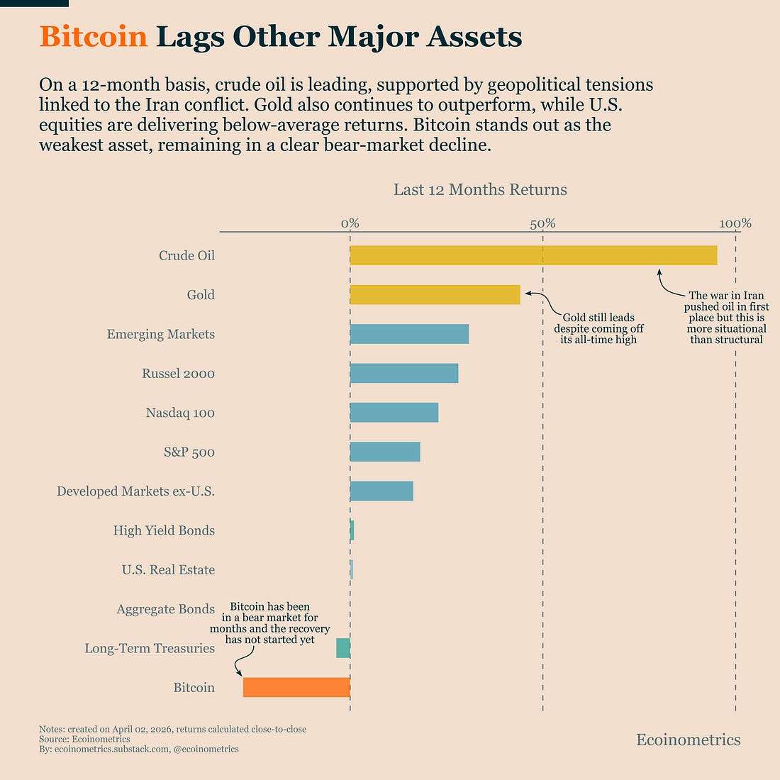 Bitcoin has been lagging other major assets for several months now. What has changed more recently is the environment around it. Equities are losing their upward trend, and the macro backdrop is becoming less supportive. Taken together, these shifts help explain why Bitcoin is still struggling to recover. Let’s look at the data. In case you missed it, here are the other topics we covered this week: Get these professional-grade insights delivered to your inbox: Bitcoin Has Become The Weakest Major AssetLooking at the past 12 months, the shift in leadership is hard to ignore. Bitcoin spent most of the bull phase in this cycle outperforming alongside gold. Today, it sits at the bottom of the table. It is not just underperforming, it is the only major asset clearly in a bear market. That’s the key point. Even with the recent macro pressure, most risk assets are still holding up on a one-year basis. U.S. equities are weaker, but they remain positive. That’s a slowdown, not a full reset, at least for now. Bitcoin is the outlier. What this tells us is that this drawdown was not just a reflection of macro conditions. Bitcoin has already gone through a deeper liquidation phase than the rest of the market. That doesn’t mean the downside is over. If macro conditions deteriorate further, Bitcoin will remain exposed and likely amplify the move. But it does create a gap. If the broader market stabilizes and risk appetite starts to recover, Bitcoin does not need perfect conditions to move higher. It already adjusted more aggressively. In that type of environment that would allow for a catch-up dynamic to take place. We are not there yet. But the relative positioning is clearly in place for when the market turns. Bitcoin Can’t Recover While Equities Drift LowerOne of the main reasons Bitcoin is struggling to recover is coming from outside crypto. The Nasdaq 100 has now broken below its 200-day moving average. This level tends to separate trending markets from corrective ones. When price holds above it, dips are usually bought. When it breaks below the chance of a deeper correction increases. The day-to-day moves in equities have been noisy, driven by headlines around the Iran conflict and shifting policy signals. But underneath that volatility, the structure is clear. The Nasdaq is in a downtrend. And that has direct consequences for Bitcoin. History tells us that when U.S. equities lose momentum, especially the tech and growth sectors, Bitcoin rarely builds a sustained recovery. You can still get sharp rebounds, but they tend to stall quickly as risk appetite remains fragile. That’s exactly what we’re seeing now. Bitcoin is trying to stabilize, but without support from equities, it lacks the fuel to move higher in a meaningful way. As long as the Nasdaq remains below its long-term trend, any upside in Bitcoin is likely to stay limited. Said differently, for Bitcoin to move back into a sustained uptrend, U.S. equities would need to reclaim their trend first. The Market Is Finally Adjusting To Higher RatesThe Federal Reserve is not preparing to bring rates back down to where they were before COVID. That has been clear for a while. The dot plots have consistently pointed to a slow and limited easing cycle, with the Fed Funds rate settling above 3% over the long run. The latest projections from March don’t change that story. At most, the Fed sees one 25bps cut this year. Beyond that, rates are expected to stay elevated, with little sign of a return to the low-rate environment that defined the previous decade. What’s changing now is not the Fed’s message. It’s how the market is reacting to it. For a long time, investors kept expecting a faster return to lower rates. That belief supported risk assets, even as the Fed stayed cautious. But recent moves in the bond market suggest that assumption is starting to break down. Short term yields are adjusting higher, and financial conditions are no longer easing. That’s a structural shift. When rates stay structurally higher, liquidity does not expand the same way it did in the past cycle. And without that tailwind, it becomes harder for risk assets to sustain strong, extended rallies. That includes Bitcoin. Bitcoin can still perform in this environment, but the bar is higher. Strong upside moves need real demand behind them, not just improving liquidity conditions. Tactical TakeawayRight now, the setup for Bitcoin is constrained from multiple angles. Bitcoin is already coming from a position of weakness, and the two main forces that usually support a recovery, risk appetite and liquidity, are not providing that support. That changes how we need to approach the market. Until at least one of risk appetite or liquidity conditions improve the demand for Bitcoin is likely to stall. A strong recovery for Bitcoin would likely require equities to stabilize and regain their trend, along with clearer signs that financial conditions are no longer tightening. Without that, upside remains limited. Until those conditions are in place, there’s no reason to add to your Bitcoin position. That’s it for today. Thanks for reading. Cheers, Nick P.S. Every week, our team conducts extensive research analyzing market data, tracking emerging trends, and creating professional-grade charts and analysis. Our mission: Deliver actionable macro and Bitcoin insights that help institutional investors and financial advisors make better-informed decisions. Ready for institutional-grade research that puts you ahead of the market? Click below to access our premium insights. Invite your friends and earn rewardsIf you enjoy Ecoinometrics, share it with your friends and earn rewards when they subscribe. |